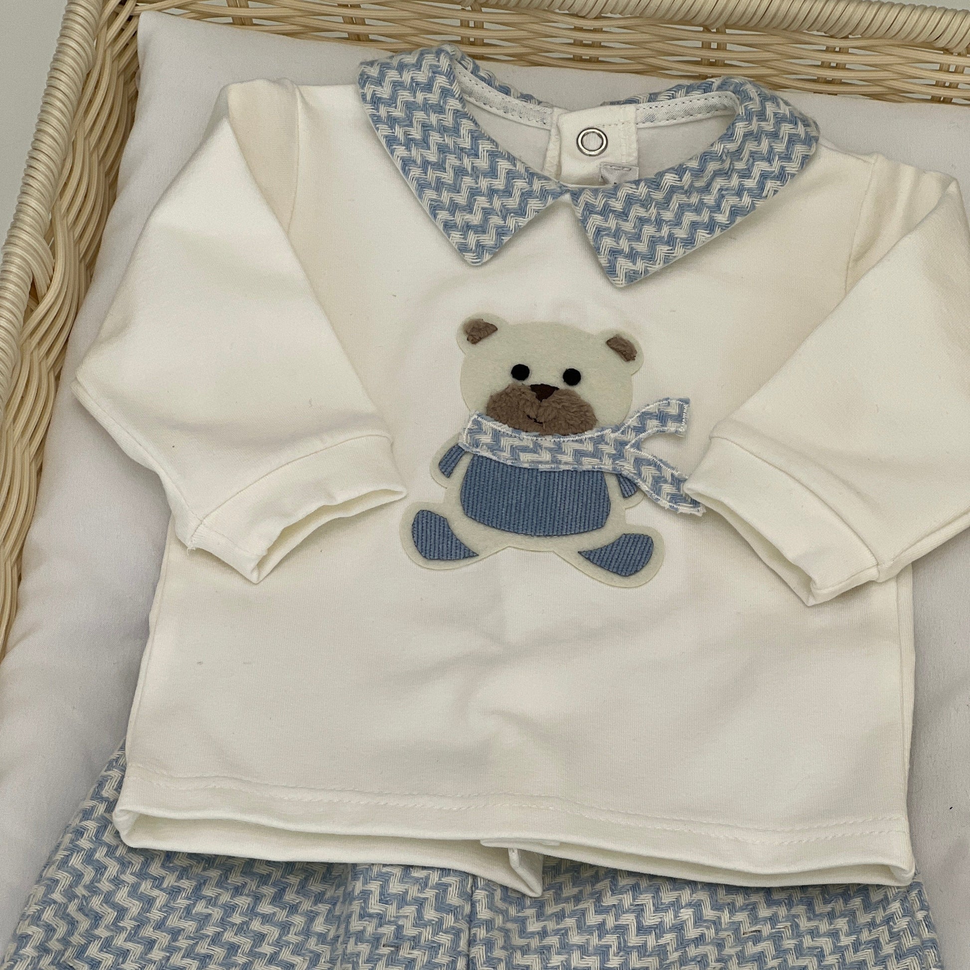 Un completo per neonato composto da una maglia felpata in caldo cotone, soffice e confortevole, perfetta per mantenere il bambino al caldo. Il pantalone coordinato è realizzato in tessuto operato, aggiungendo un tocco di eleganza e texture raffinata al look, mantenendo sempre la massima comodità.