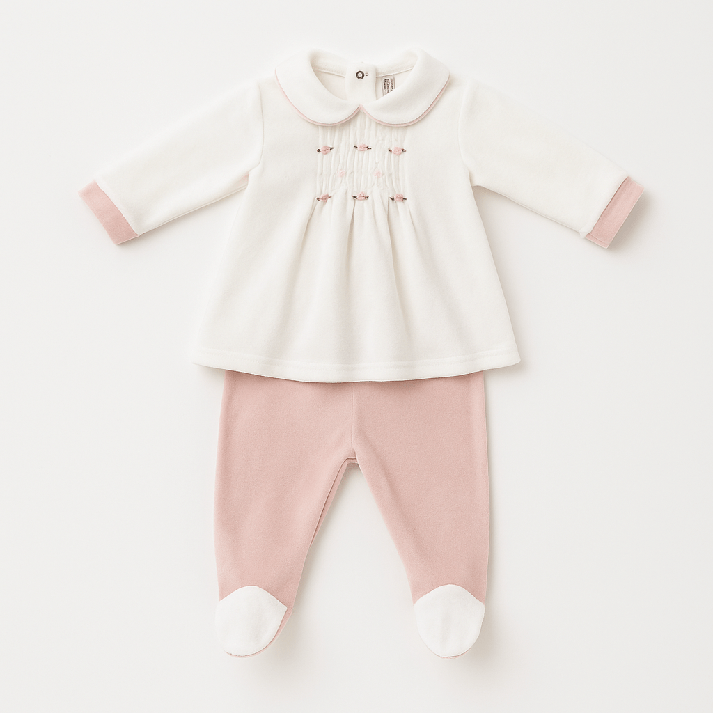 Tutina spezzata in ciniglia per neonata, con raffinato punto smock e roselline applicate. Morbida ed elegante, perfetta per le occasioni speciali.