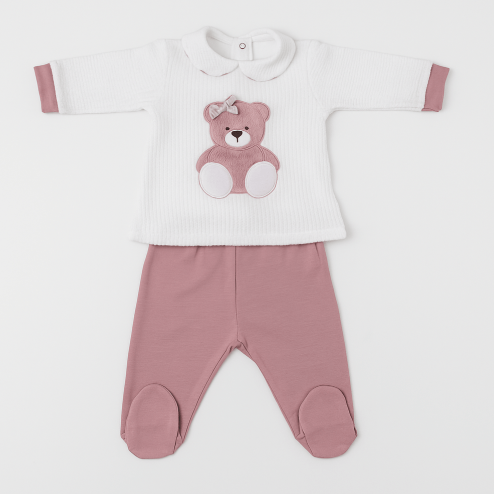 Tutina intera in ciniglia con trama rialzata a quadretti e applicazione di orsetto. Morbida e confortevole, ideale per avvolgere il neonato con dolcezza.
