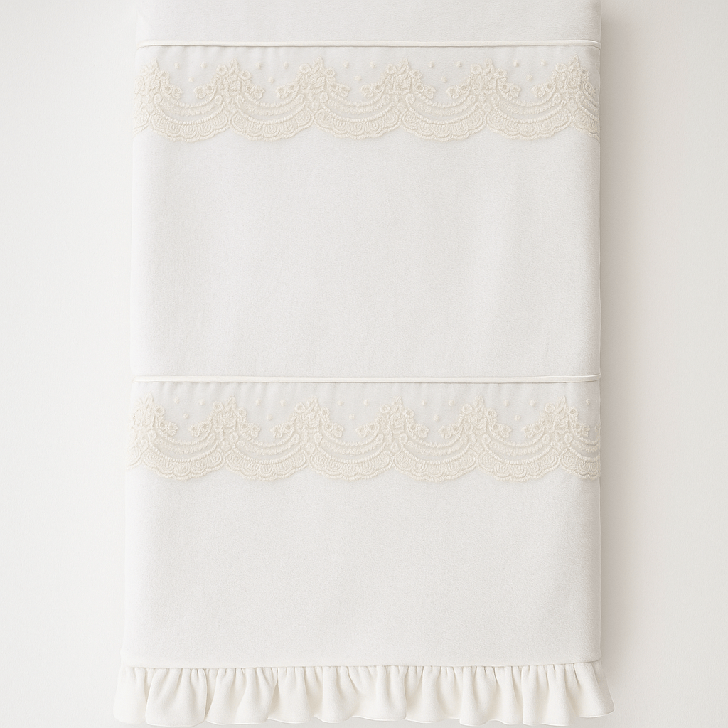 Coperta in morbida ciniglia avorio, rifinita con due fasce ricamate tono su tono e balza arricciata sul bordo. Un modello raffinato e delicato, ideale per completare il corredino con eleganza.