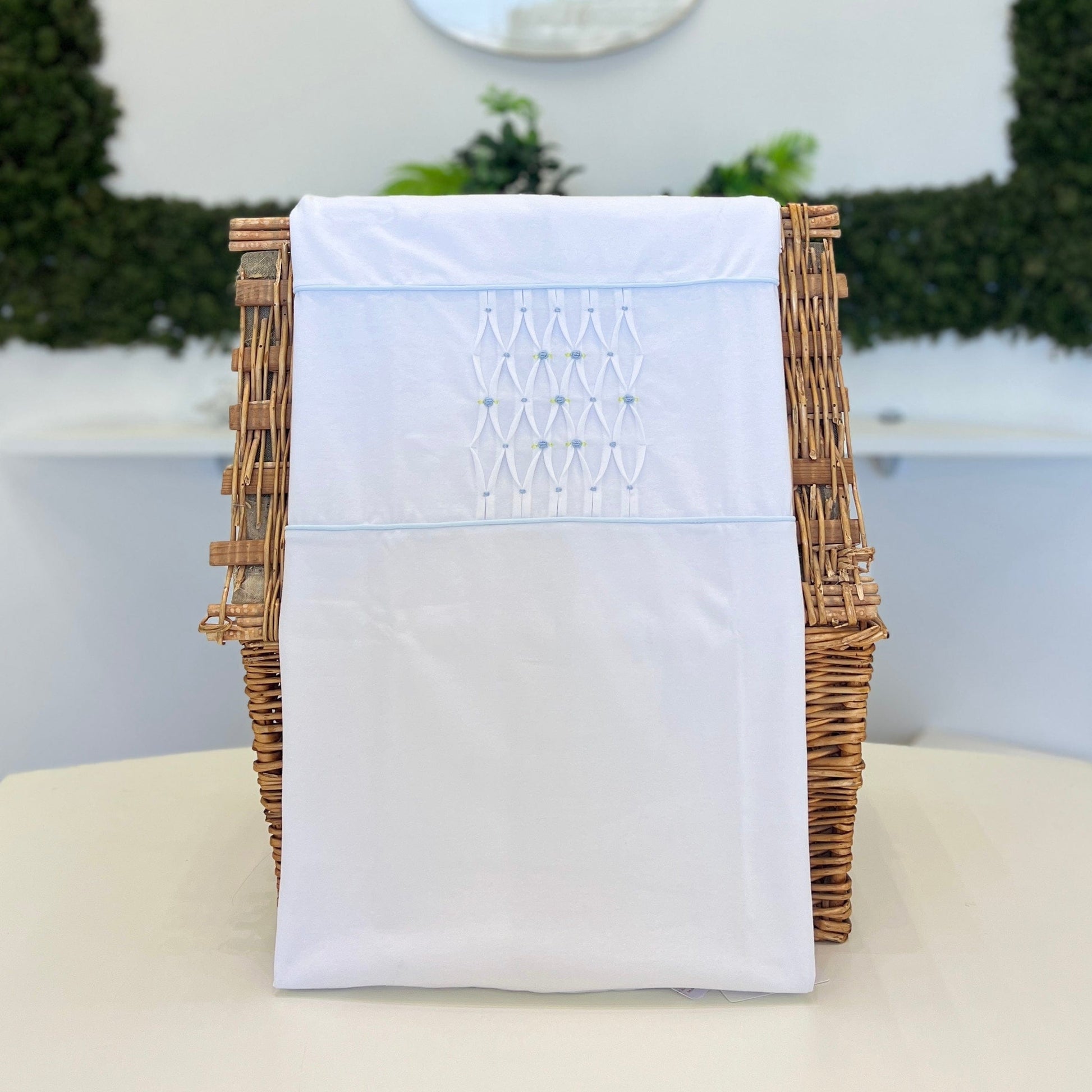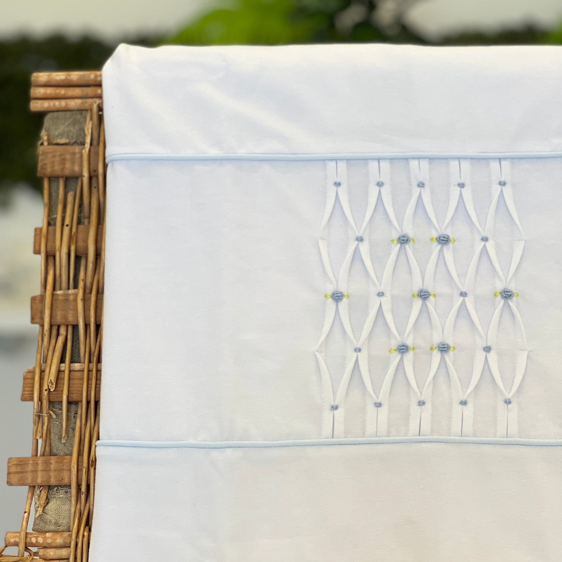 Coperta in cotone jersey con punto smock, arricchita da delicate rosette a vapore. Un accessorio morbido e raffinato, perfetto per avvolgere la tua piccola in eleganza e comfort.