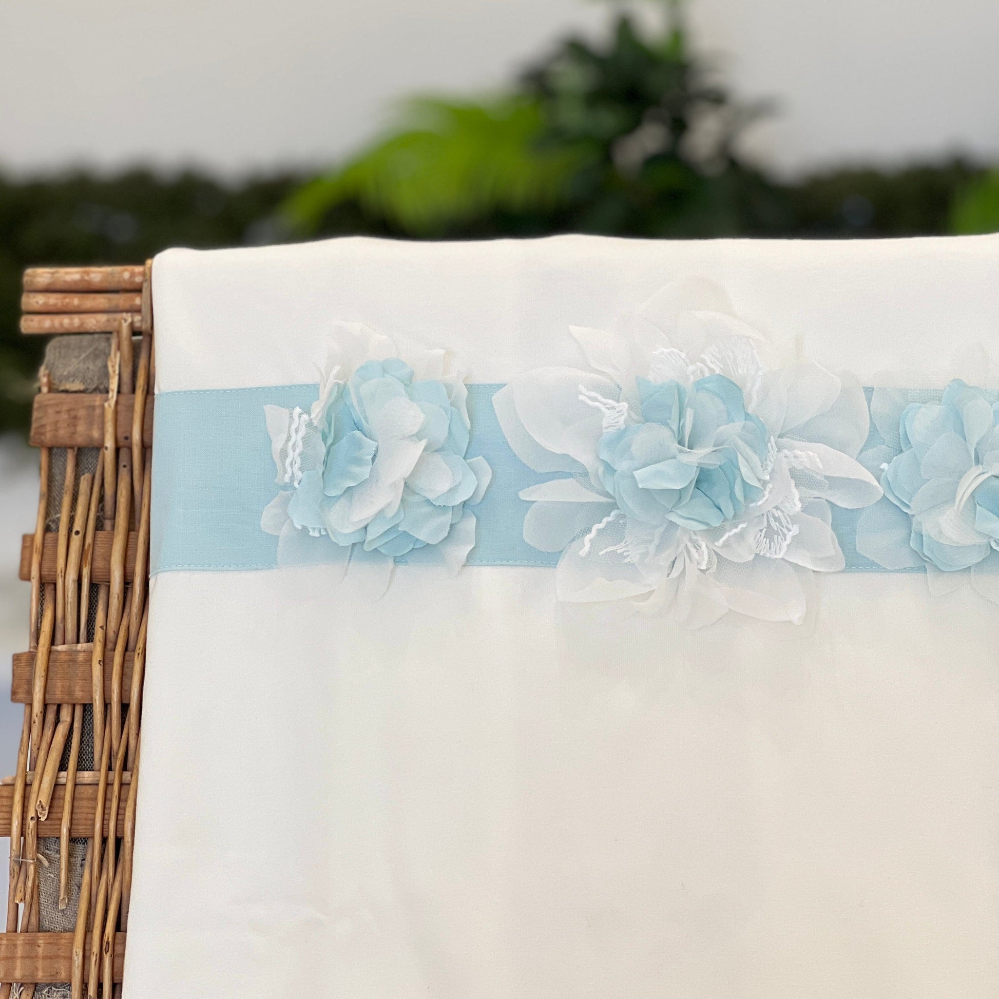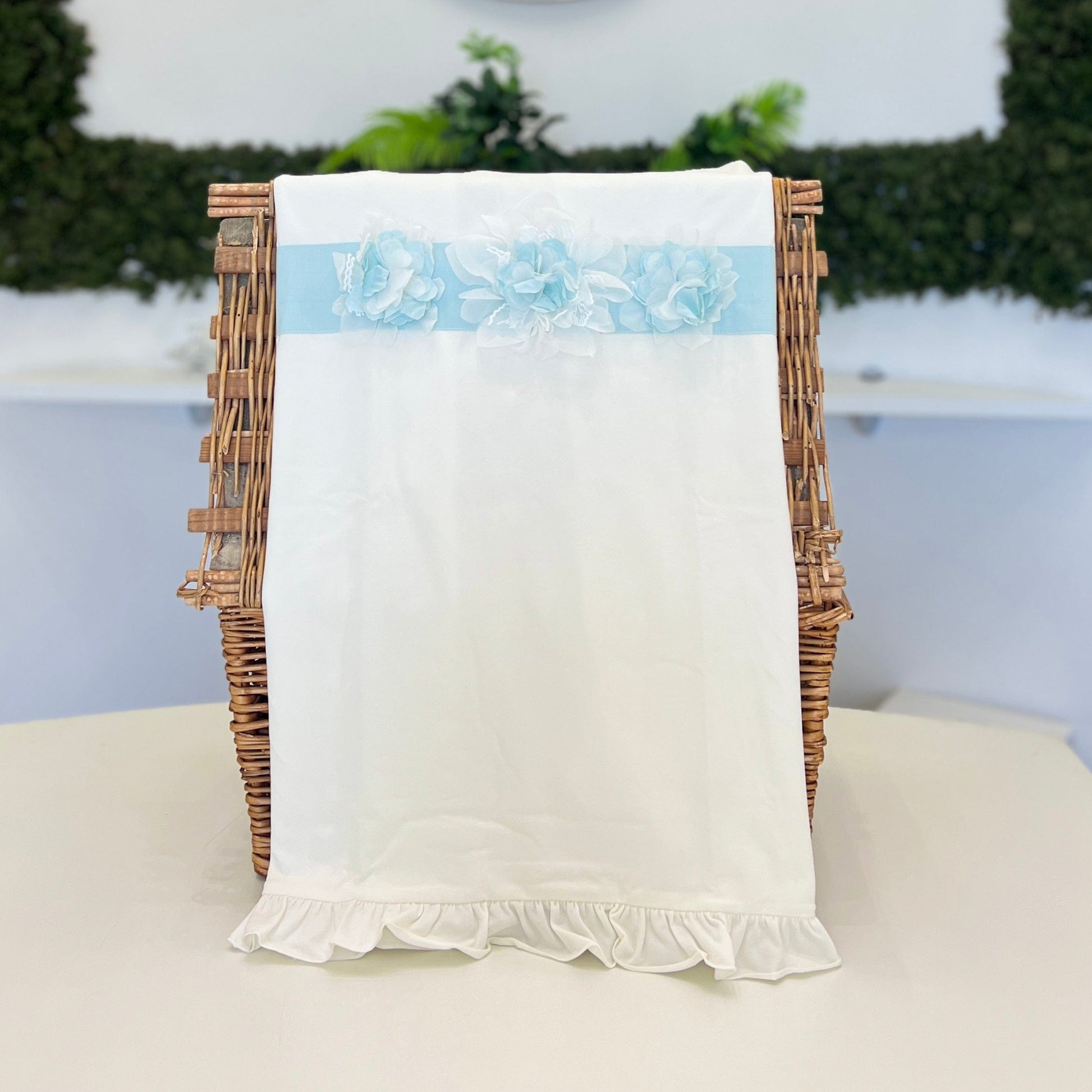 Copertina in cotone jersey per neonata, morbida e avvolgente. Il bordo con rouches aggiunge un tocco raffinato, mentre il dettaglio centrale di fiori in taffetà dona eleganza. Ideale per accompagnare i primi momenti con stile e delicatezza.