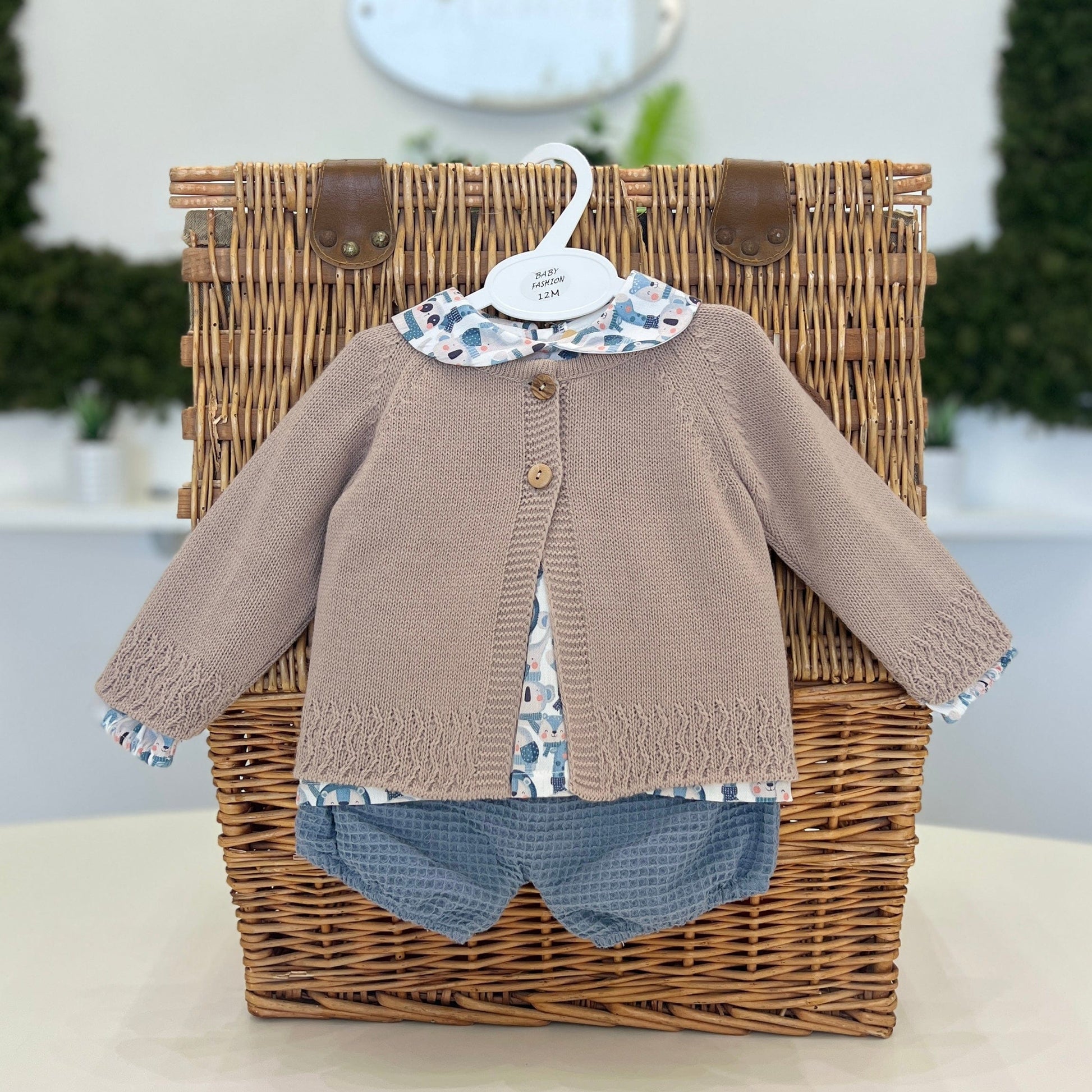 Completo con pantaloncino nido d'ape, camicia con stampa animaletti e cardigan doppio bottone sul petto.