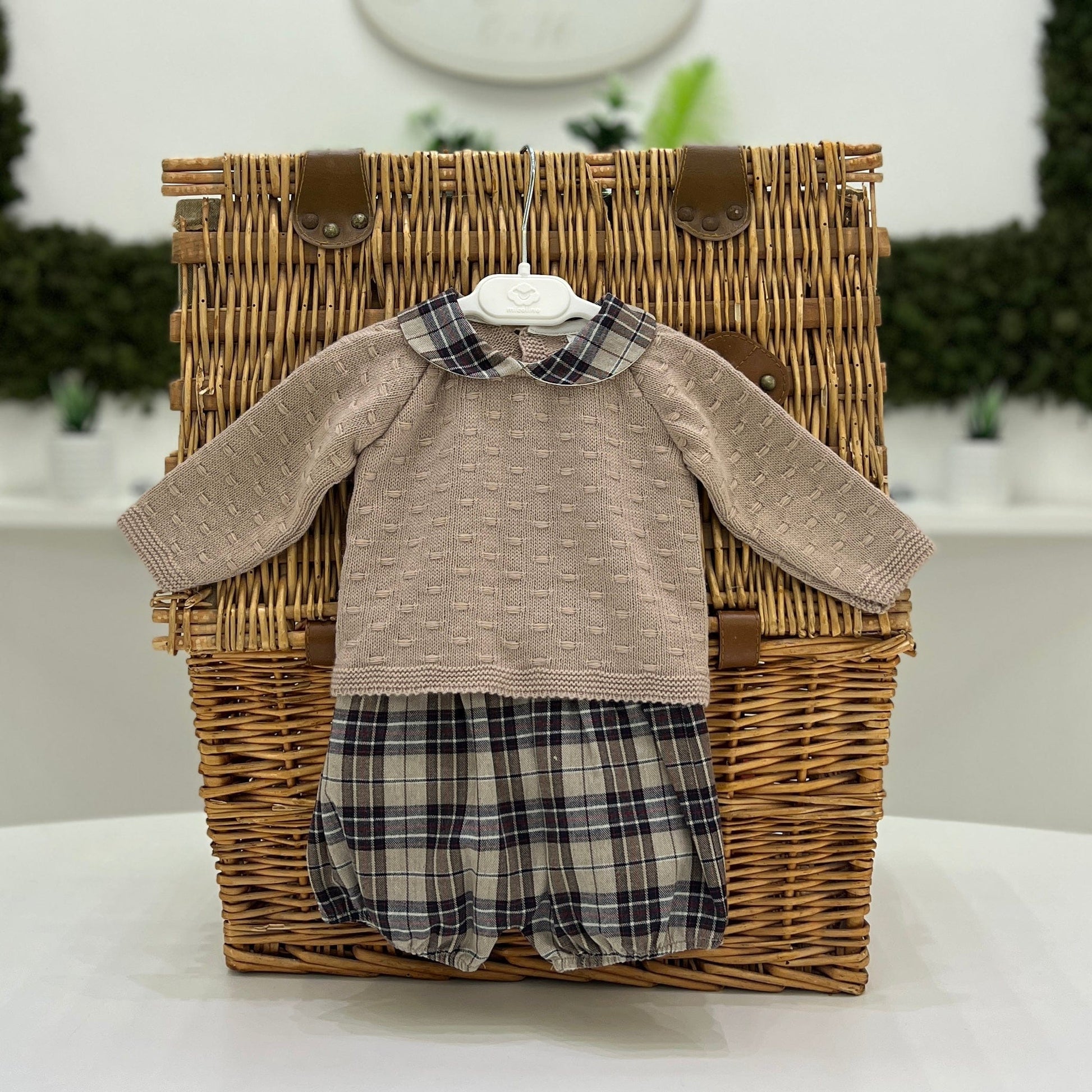 Completo con maglia in misto lana e bermuda fantasia scozzese.