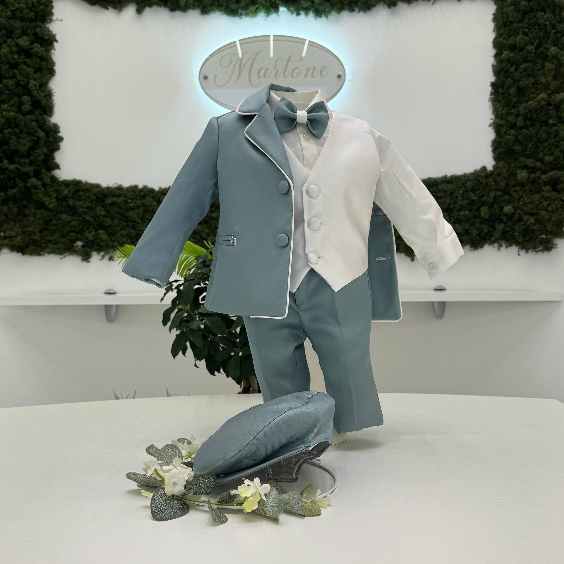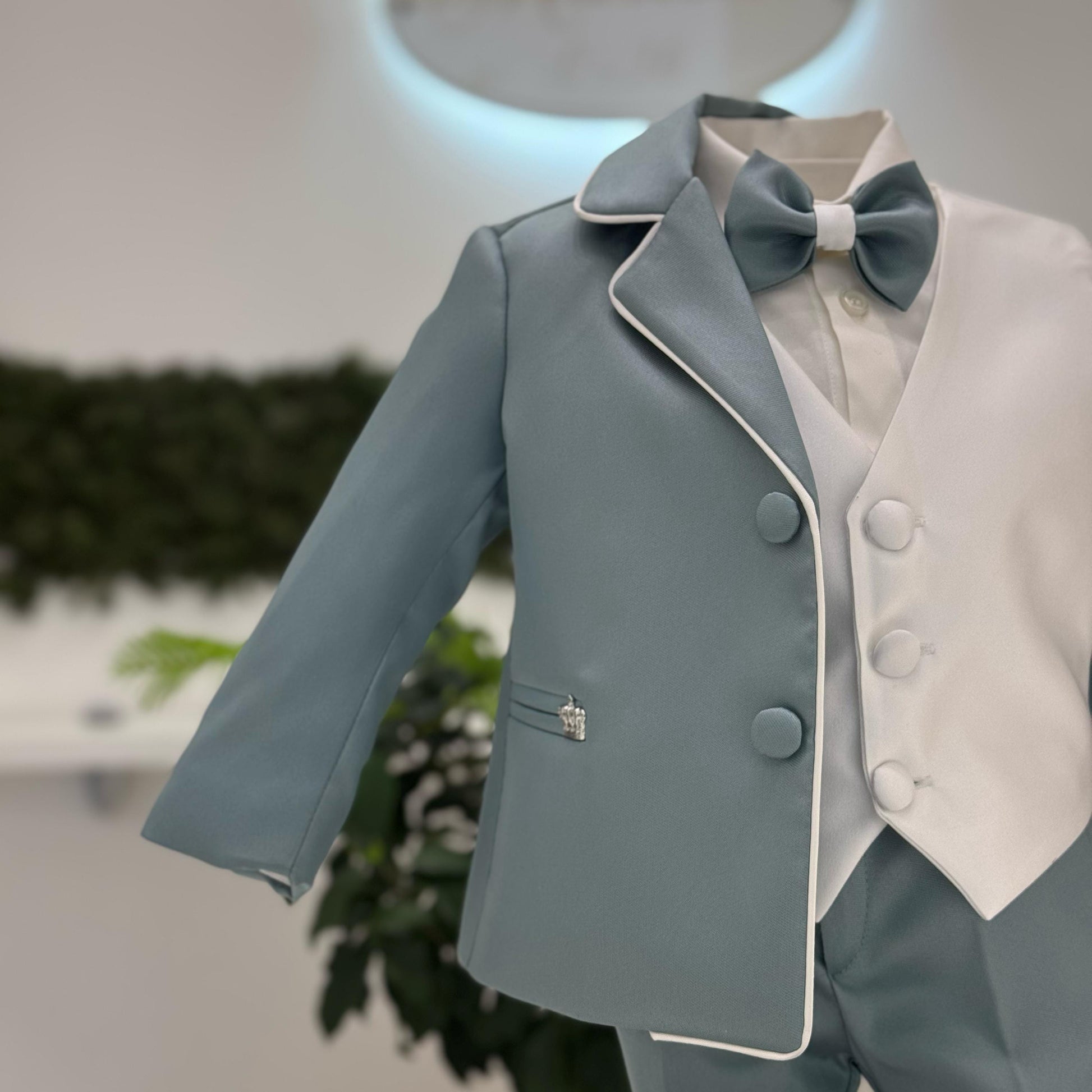 Un abito battesimale raffinato e dal carattere distintivo, perfetto per un’occasione speciale. La giacca in mikado verde, impreziosita da profili bianchi a contrasto, dona un’eleganza sofisticata e ricercata. Il gilet in mikado bianco, dal taglio impeccabile, crea un raffinato gioco di contrasti con il pantalone coordinato, realizzato nello stesso tessuto della giacca per un look armonioso. La camicia in cotone bianco assicura freschezza e comfort, mentre il papillon abbinato completa l’outfit con un tocco di classe. Un completo esclusivo per un battesimo indimenticabile.