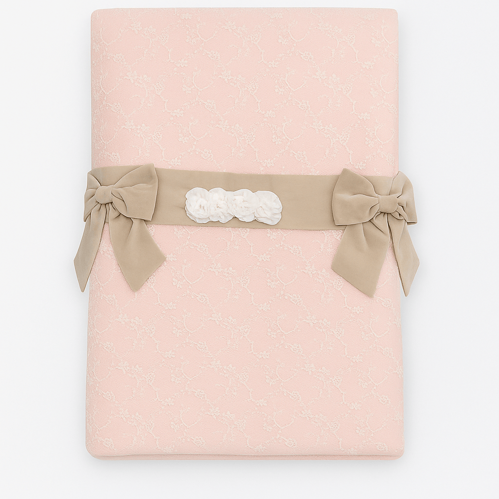 Coperta rosa cipria con strato in pizzo sovrapposto, impreziosita da nastro beige con fiocchi laterali e applicazioni floreali centrali. Una proposta elegante e ricercata