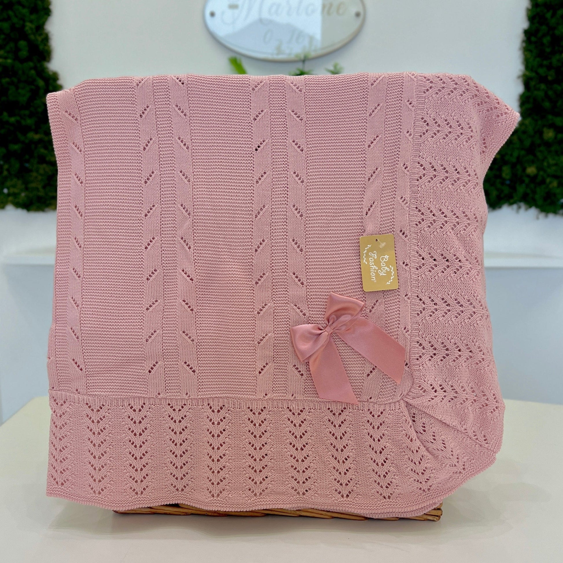 Copertina in lana sintetica lavorata a maglia con trafori e smerlo, fiocco in raso come decoro.