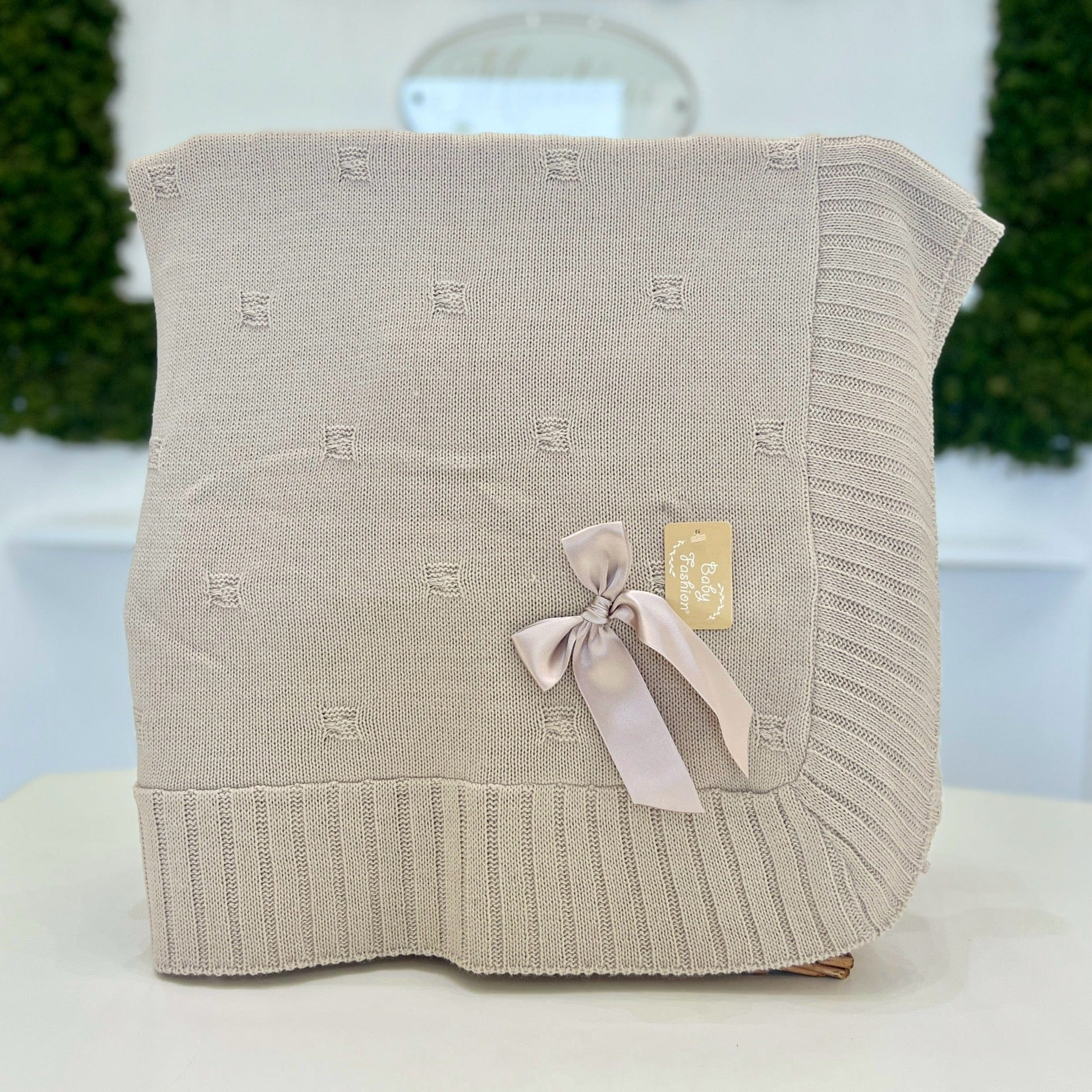 Copertina in lana sintetica lavorata a maglia con e smerlo, fiocco in raso come decoro.