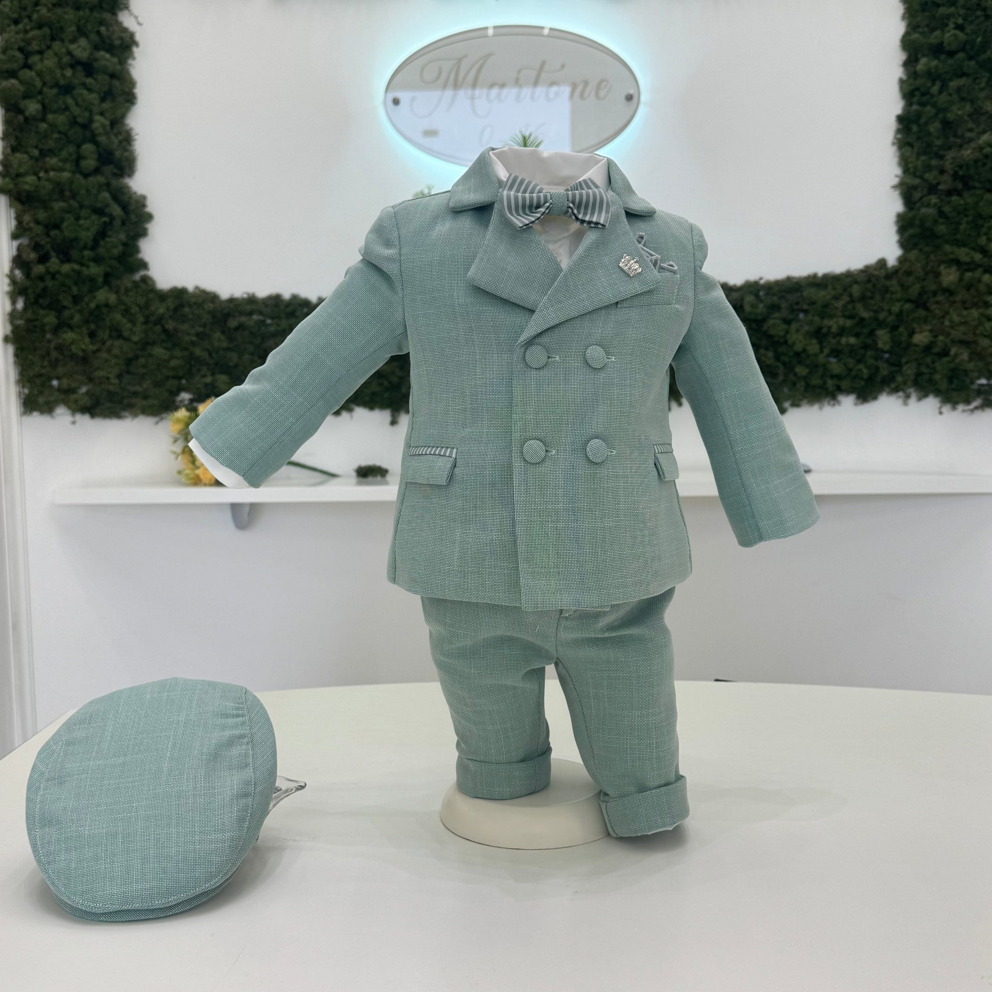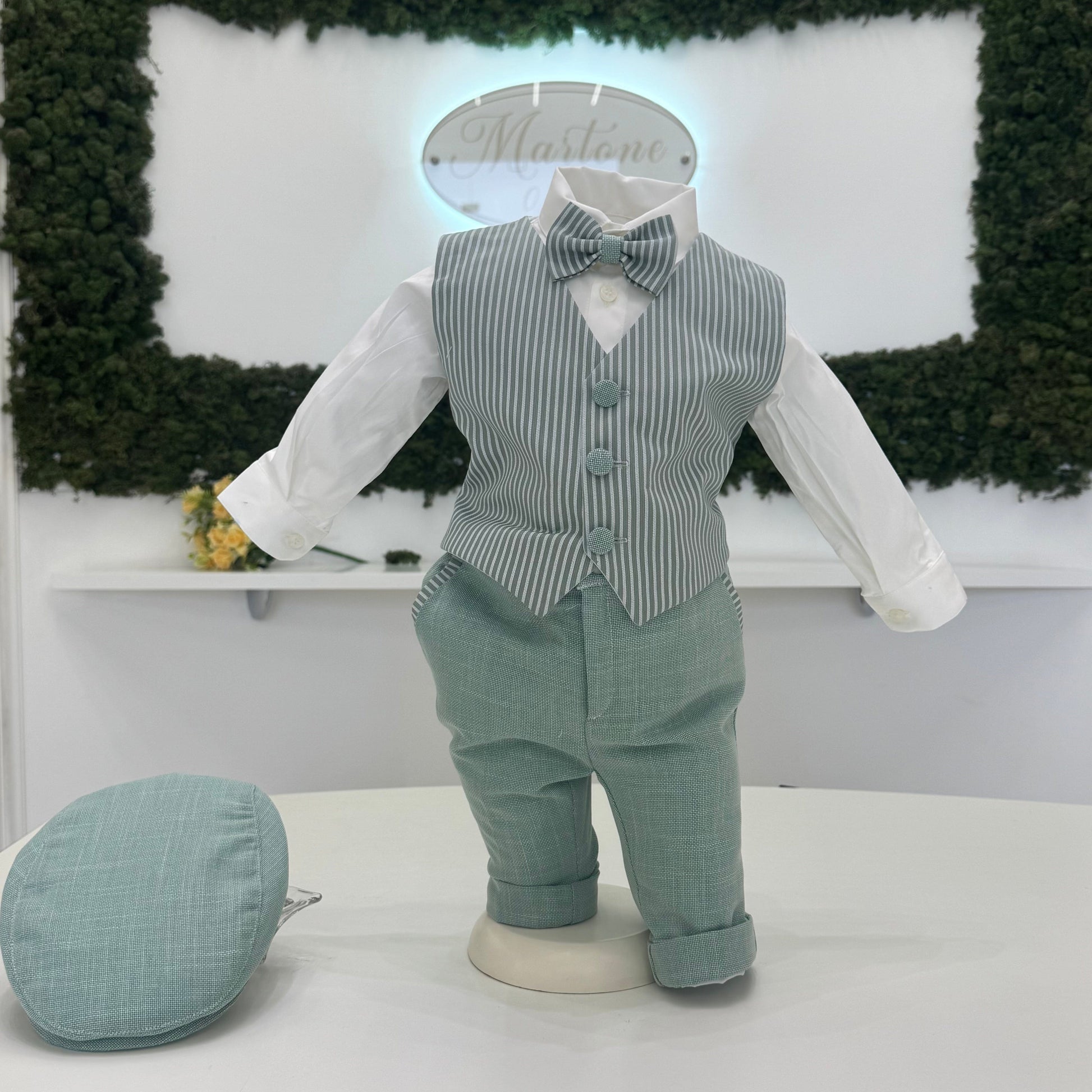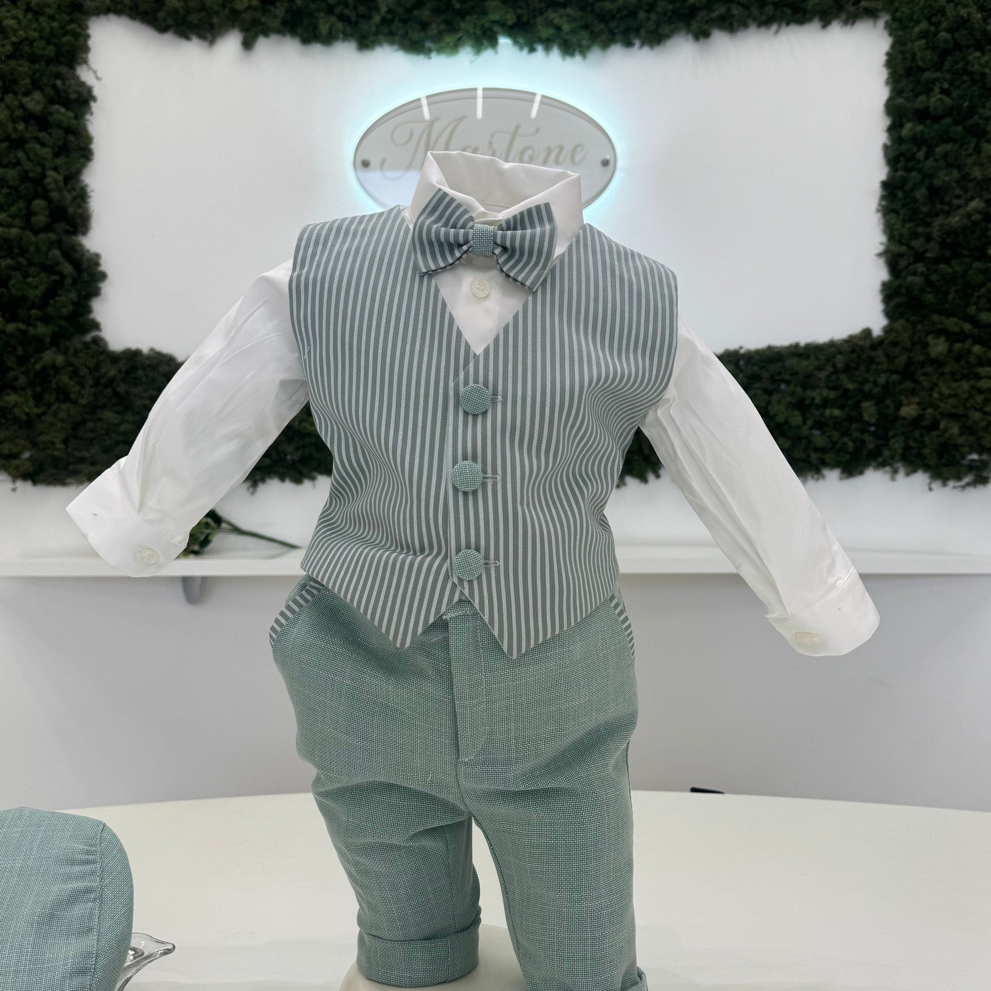 Completo cerimonia artigianale in raffinata tonalità verde salvia, composto da giacca doppiopetto, gilet a righe coordinato, camicia, pantalone con risvolto, papillon abbinato. Linee sartoriali e tessuto dall’effetto naturale valorizzano un’eleganza ricercata, perfetta per battesimo e cerimonie speciali. Un capo esclusivo, curato nei dettagli, che esprime stile e personalità con un tocco distintivo.