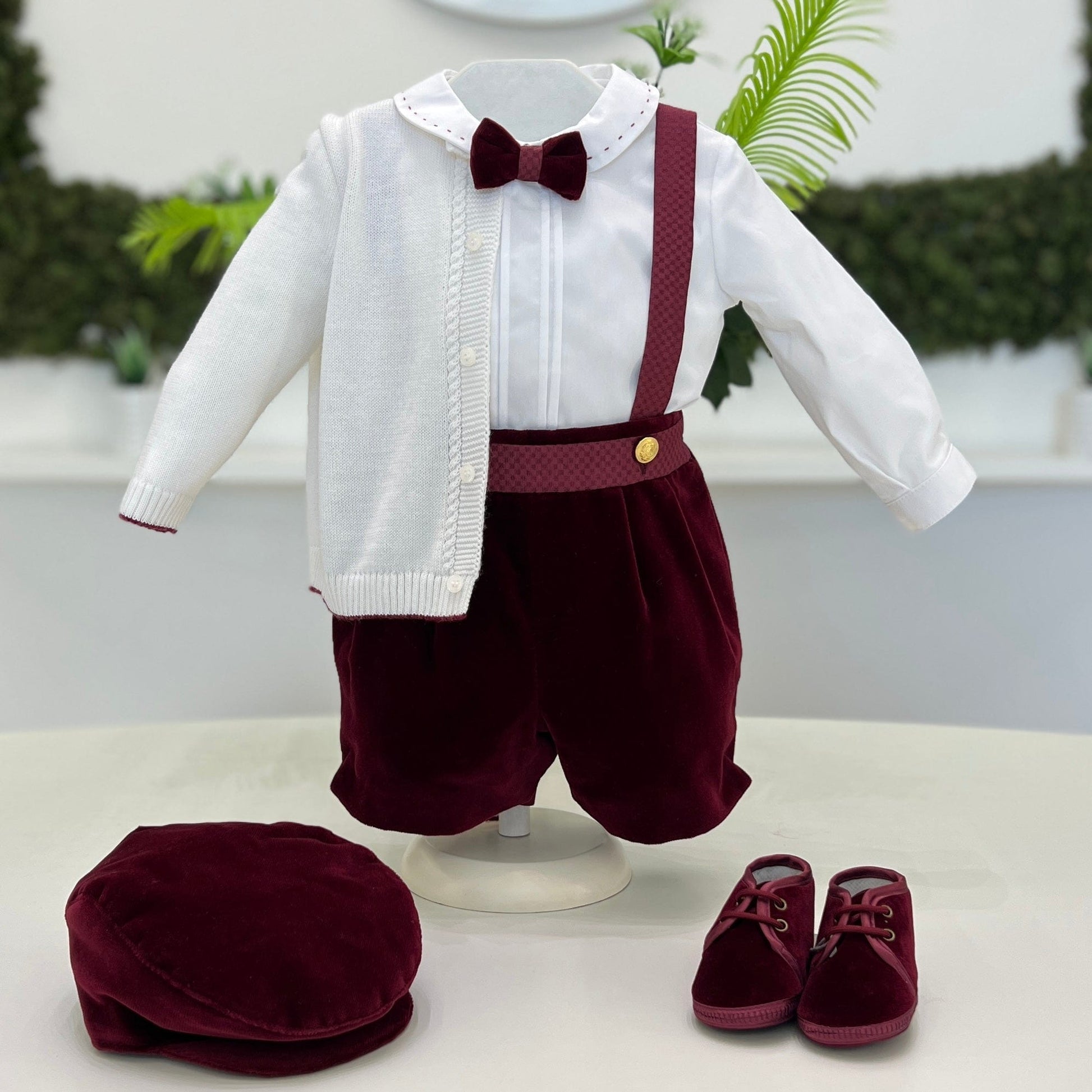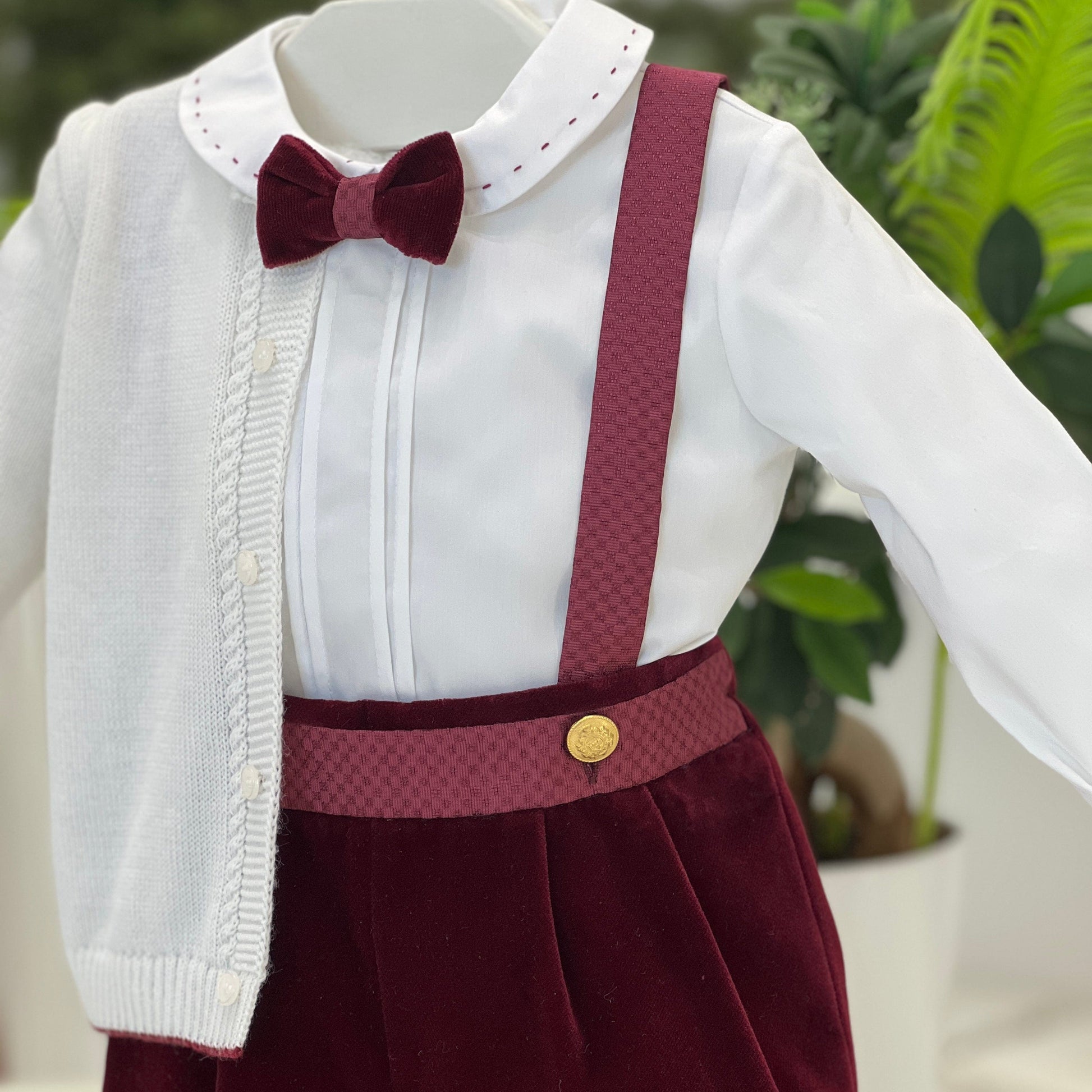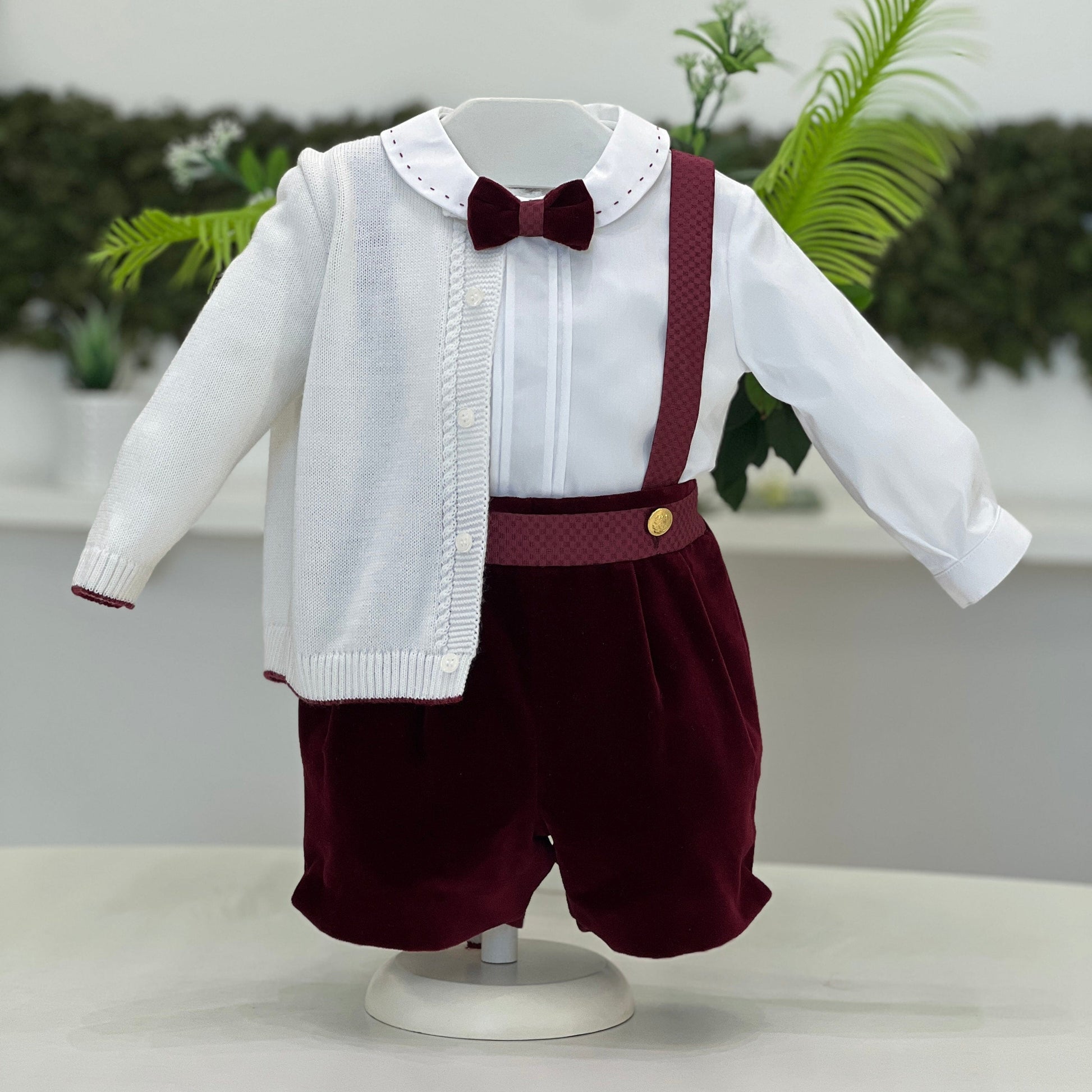 Completo battesimale elegante per bambino composto da camicia bianca in cotone con colletto ricamato a contrasto e papillon in velluto bordeaux coordinato. Pantaloncini in velluto bordeaux con bretelle a trama jacquard e bottoni dorati. A completare l’outfit, cardigan in maglia bianca con bordo rifinito e dettagli tono su tono. Un abito raffinato e curato nei particolari, perfetto per il giorno del battesimo e le occasioni più speciali.