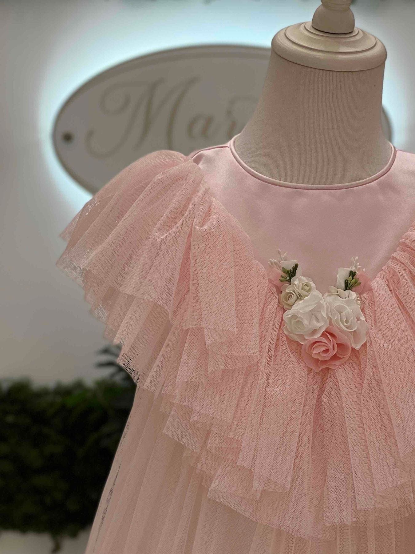 Abito bimba svasato con balze di tulle plimetis e dettaglio floreale.
