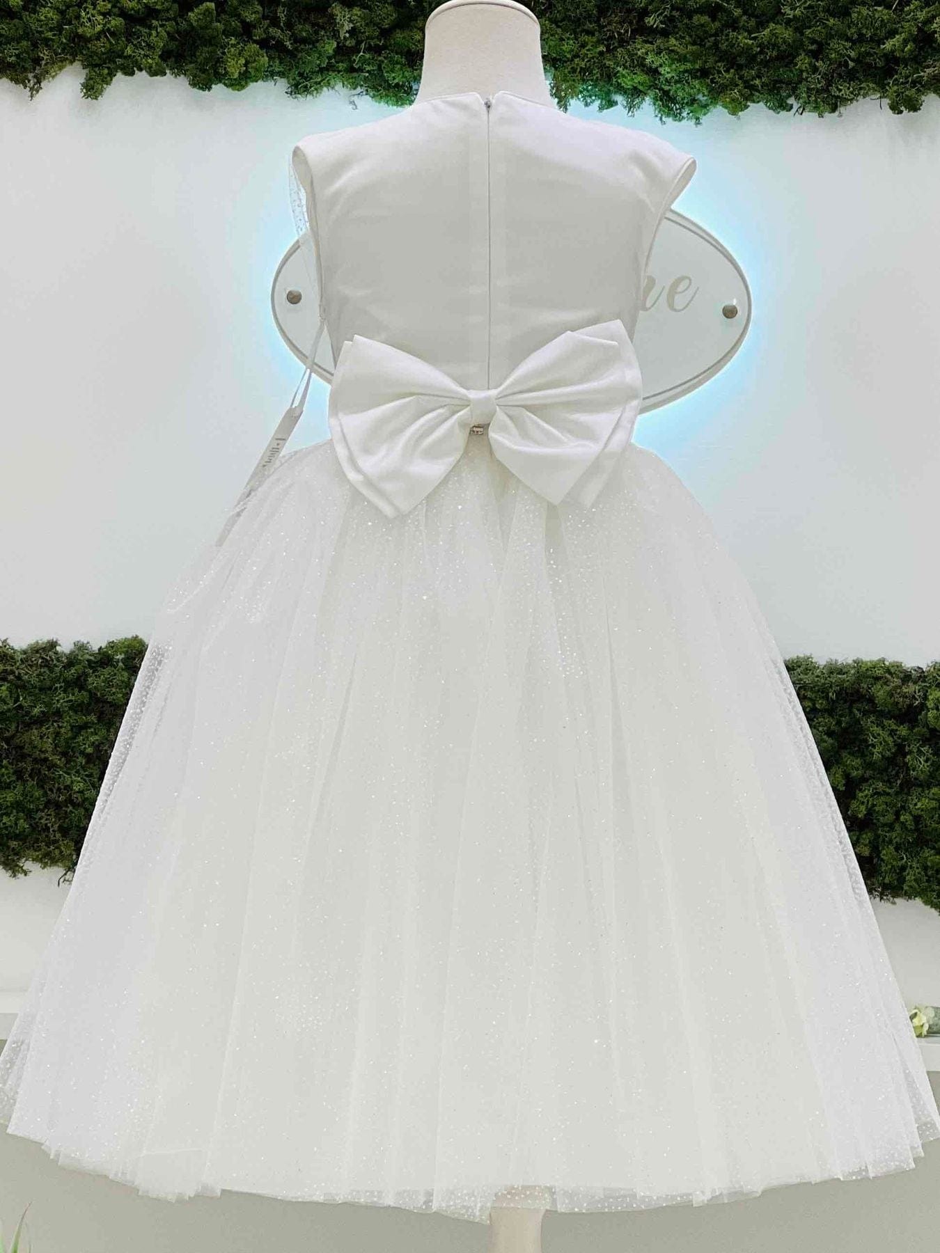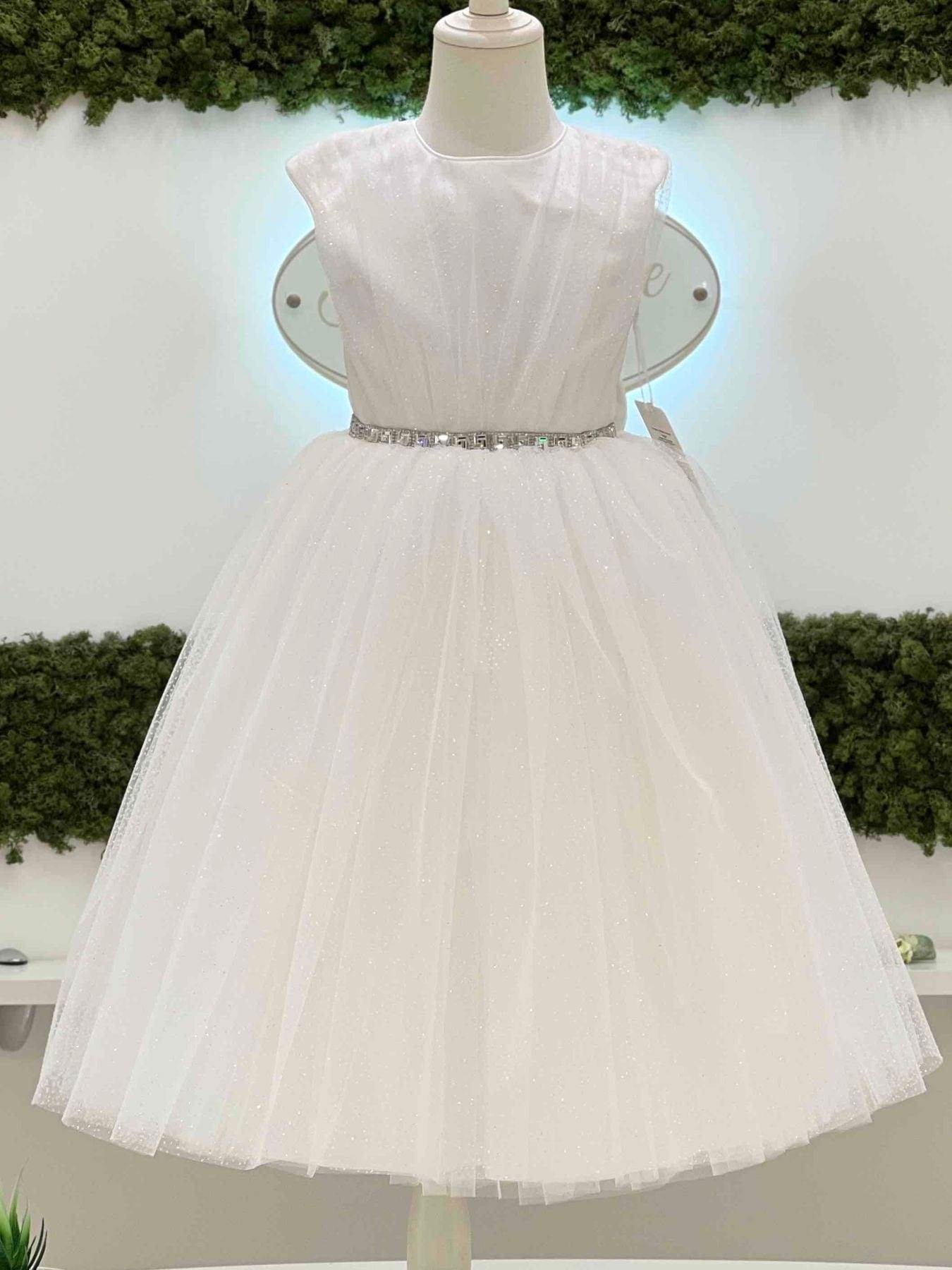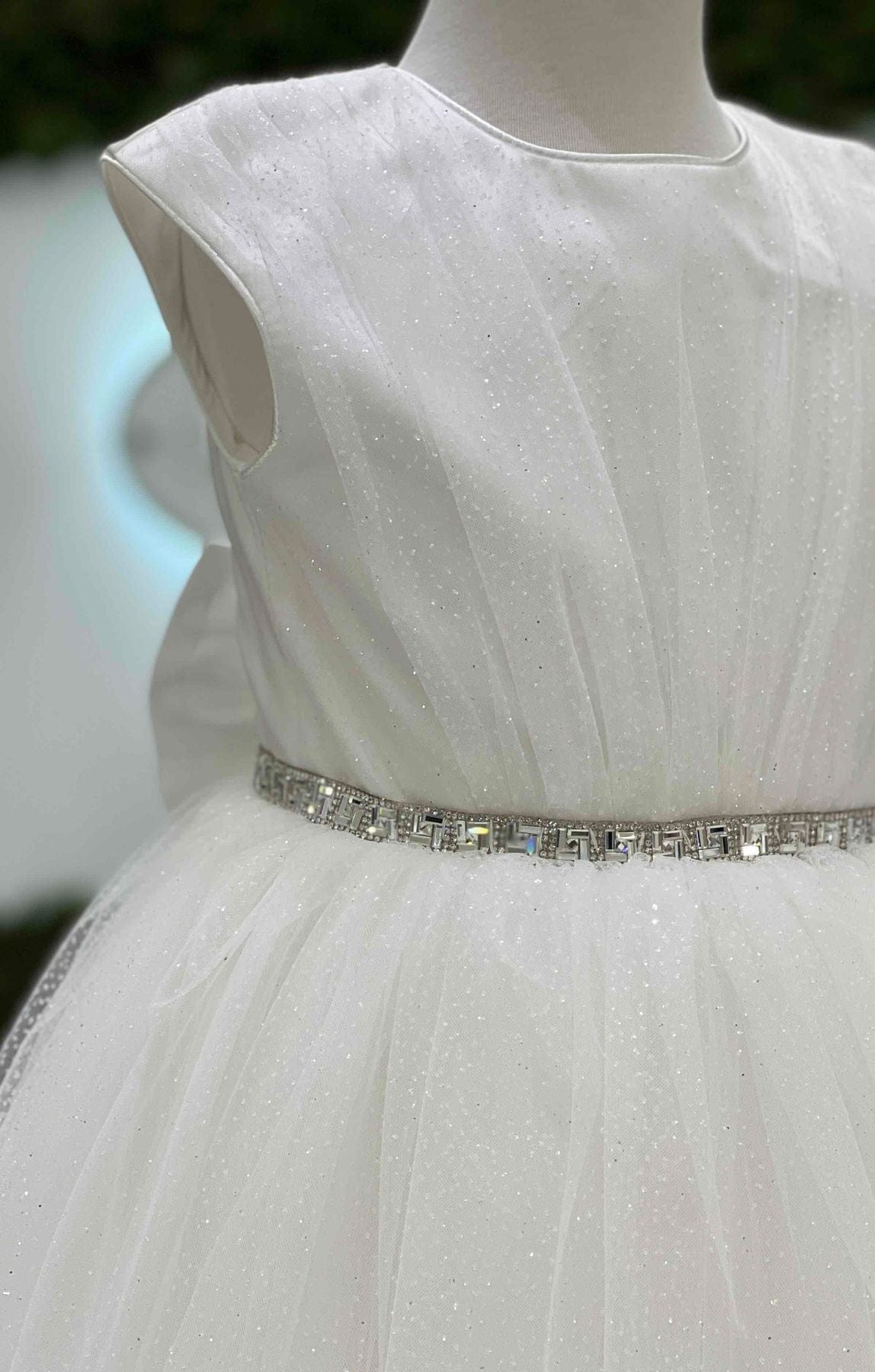 Abito damina in tulle brillantinato, con fiocco sul retro e cinturino gioiello in vita.