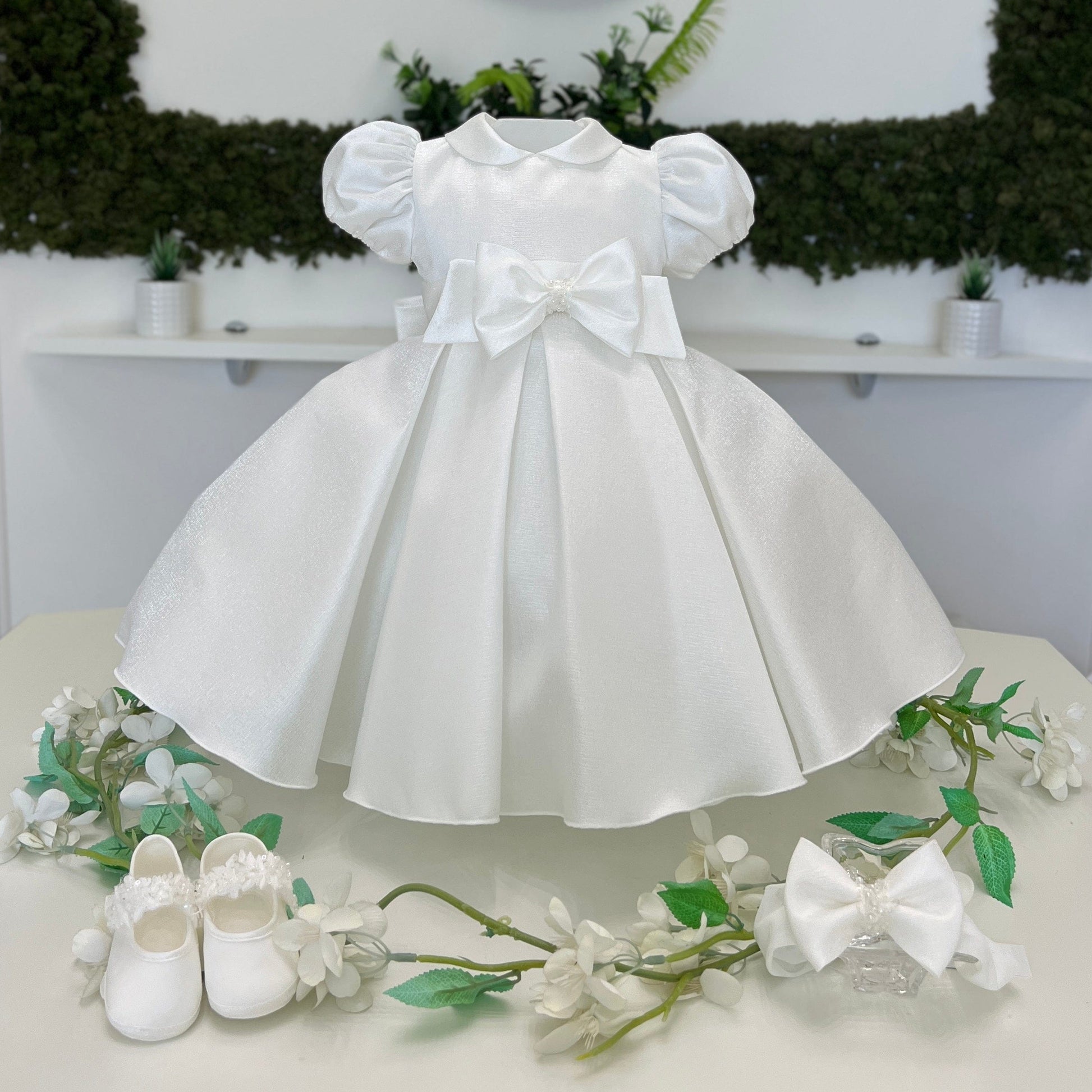 Abito battesimale in tessuto duchesse laminato, caratterizzato da corpino liscio con colletto tondo, maniche a sbuffo e gonna ampia con pieghe profonde. Completato da un elegante fiocco centrale decorato con perle, manicotti coordinati e culotte copripannolino.