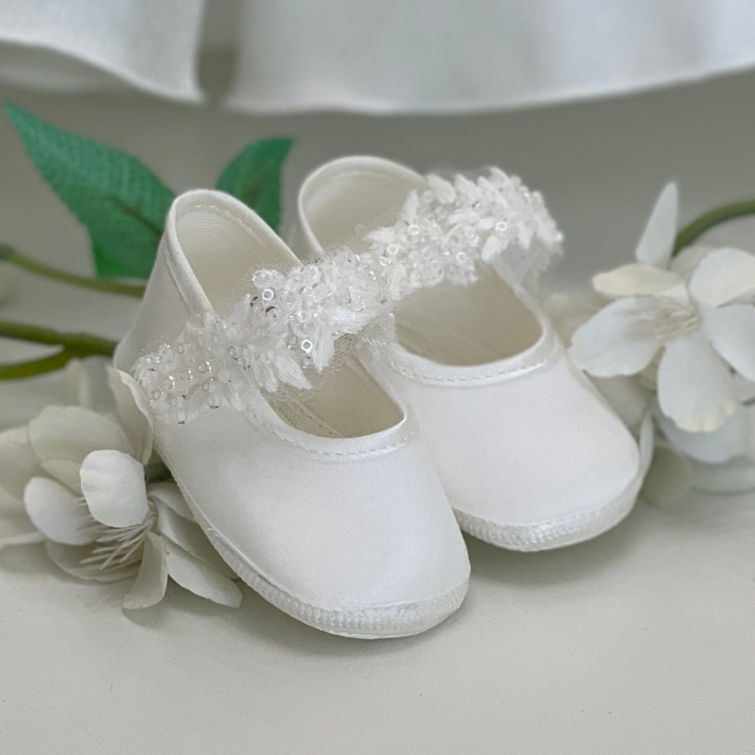 Scarpina battesimale per neonata, cinturino impreziosito da canottiglie con chiusura laterale, un accessorio elegante e studiato nei minimi dettagli per completare il look della tua piccola nel giorno del suo battesimo.