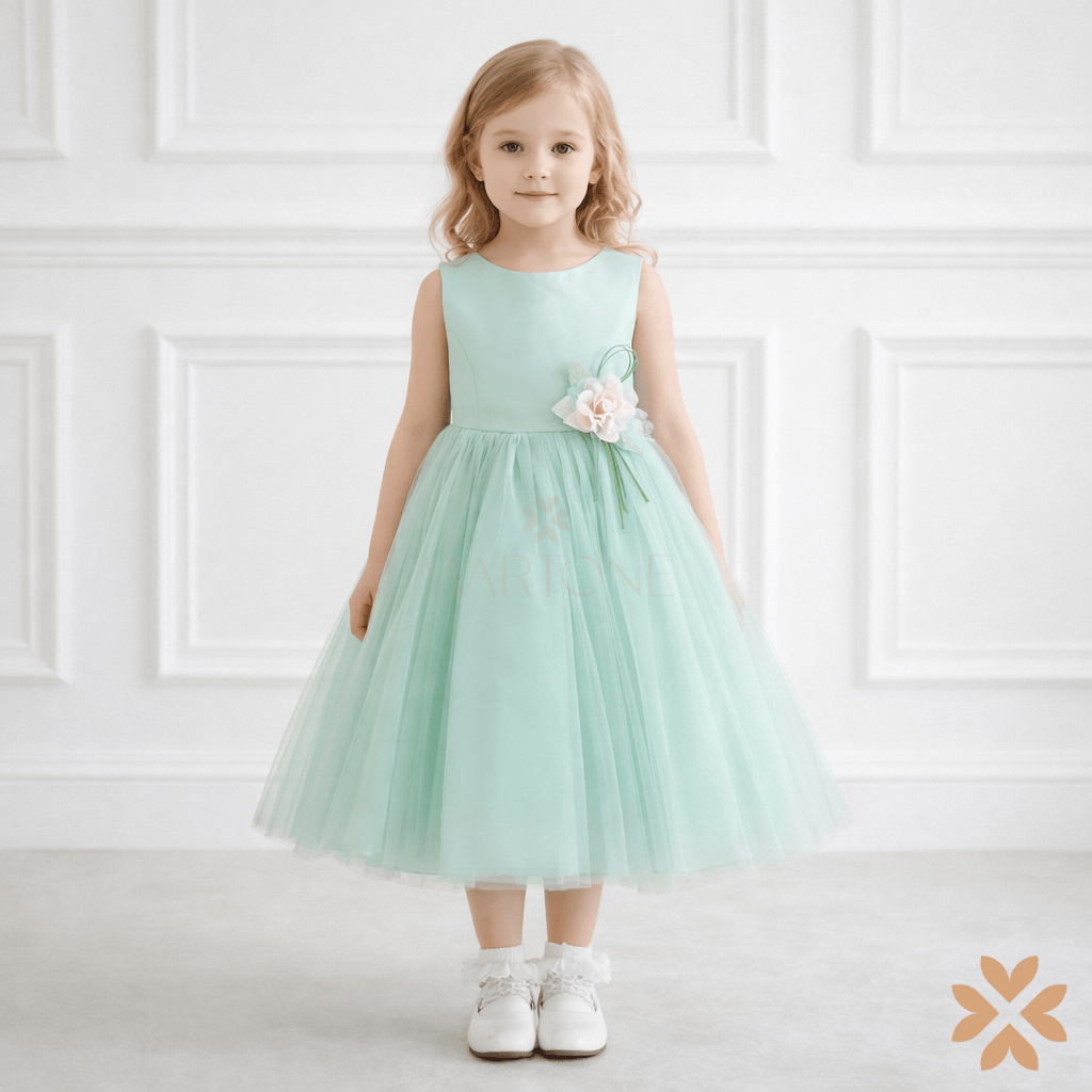 Abito damina composto da gonna in tulle, corpetto in mikado e cintura con fiocco sul retro con dettaglio floreale.