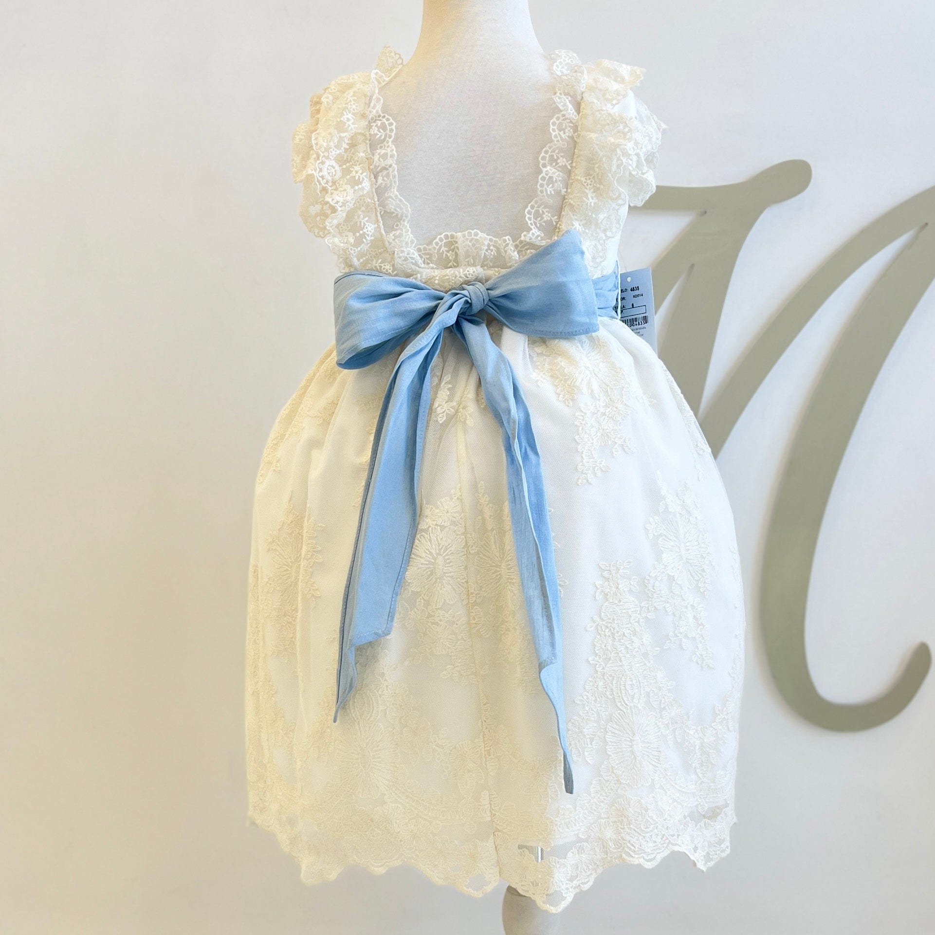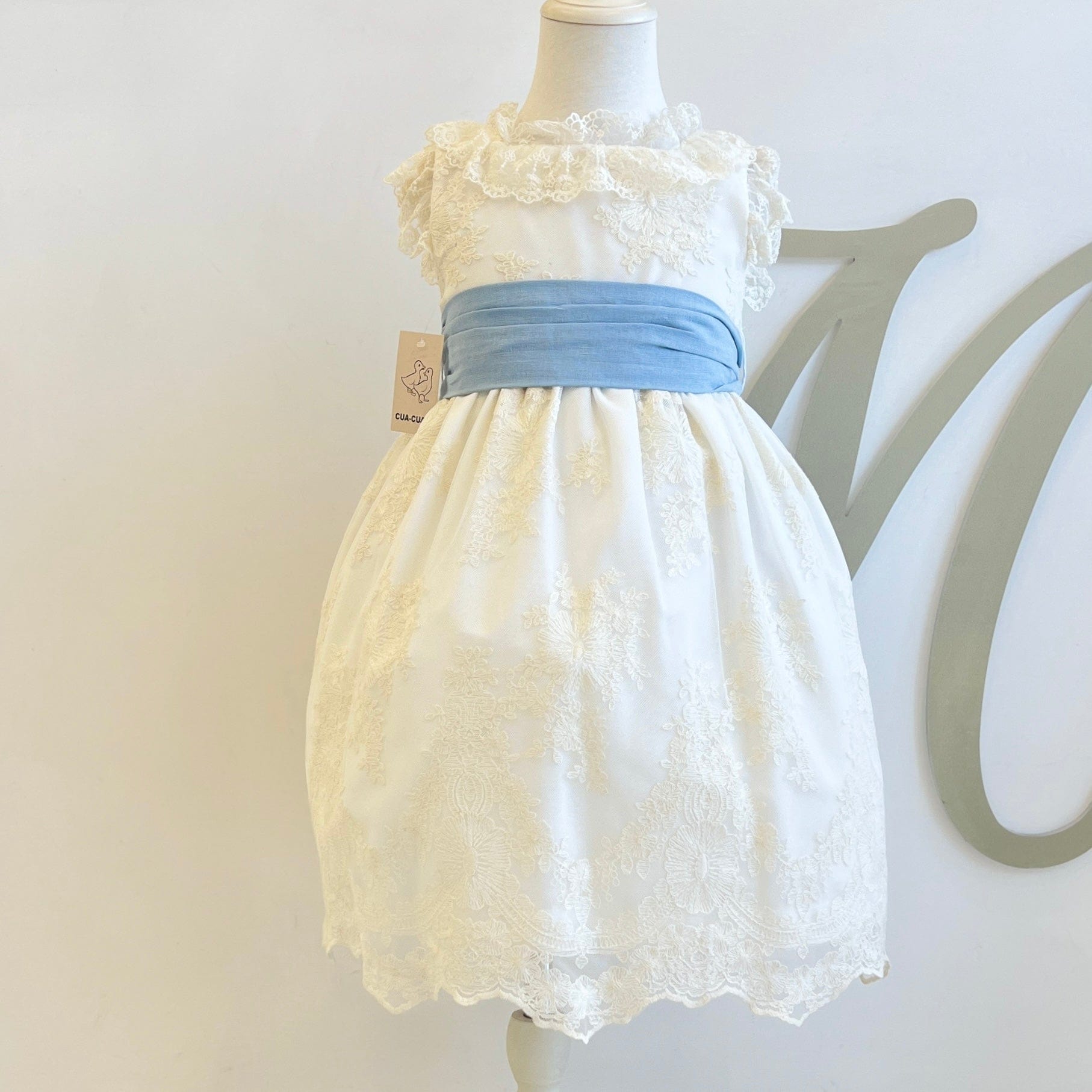 Abito da cerimonia in pizzo, con rouches sul collo e retro. Cintura in lino celeste.