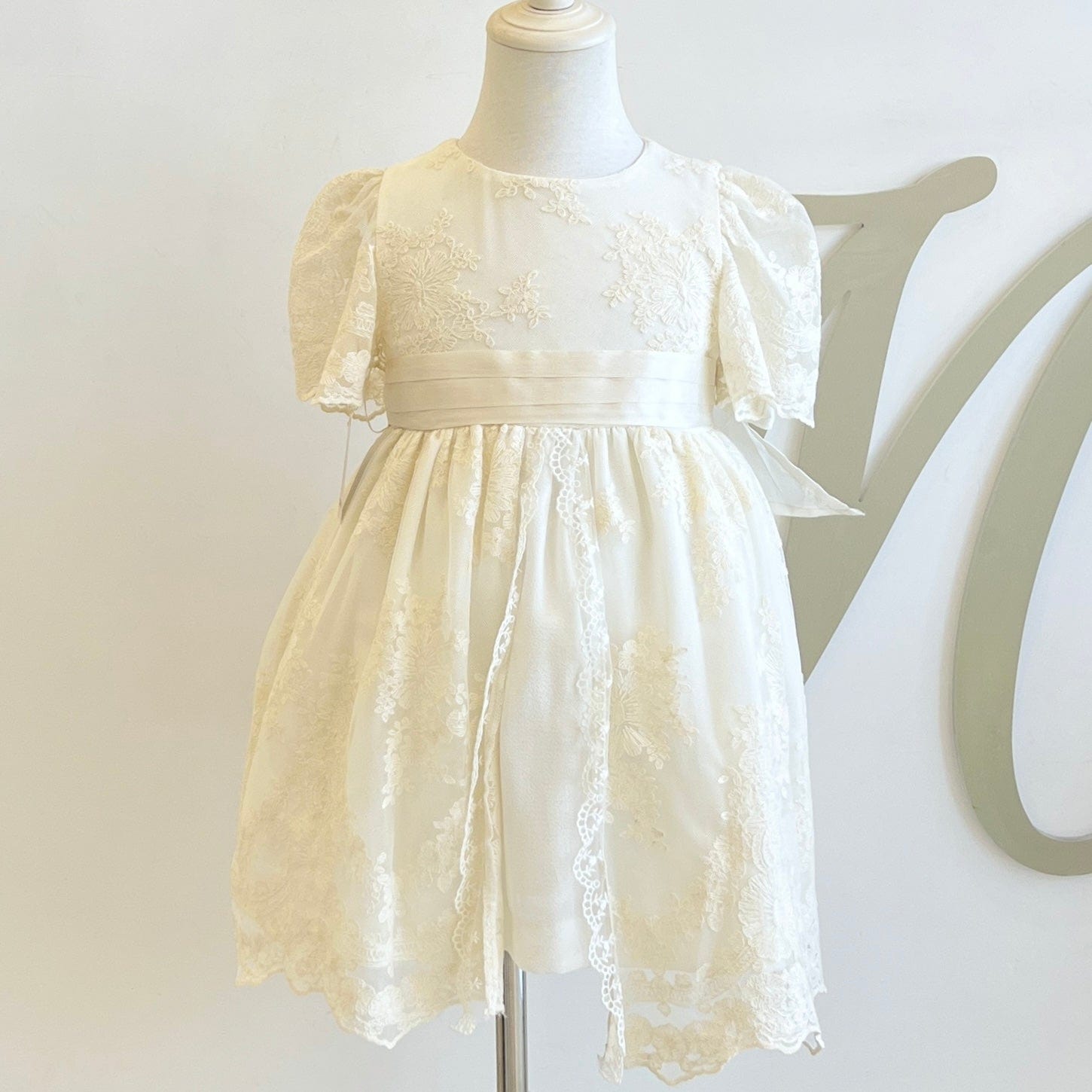 Abito damina in realizzato in pizzo con balze frontali, cintura in vita e scollo a diamante sul retro.