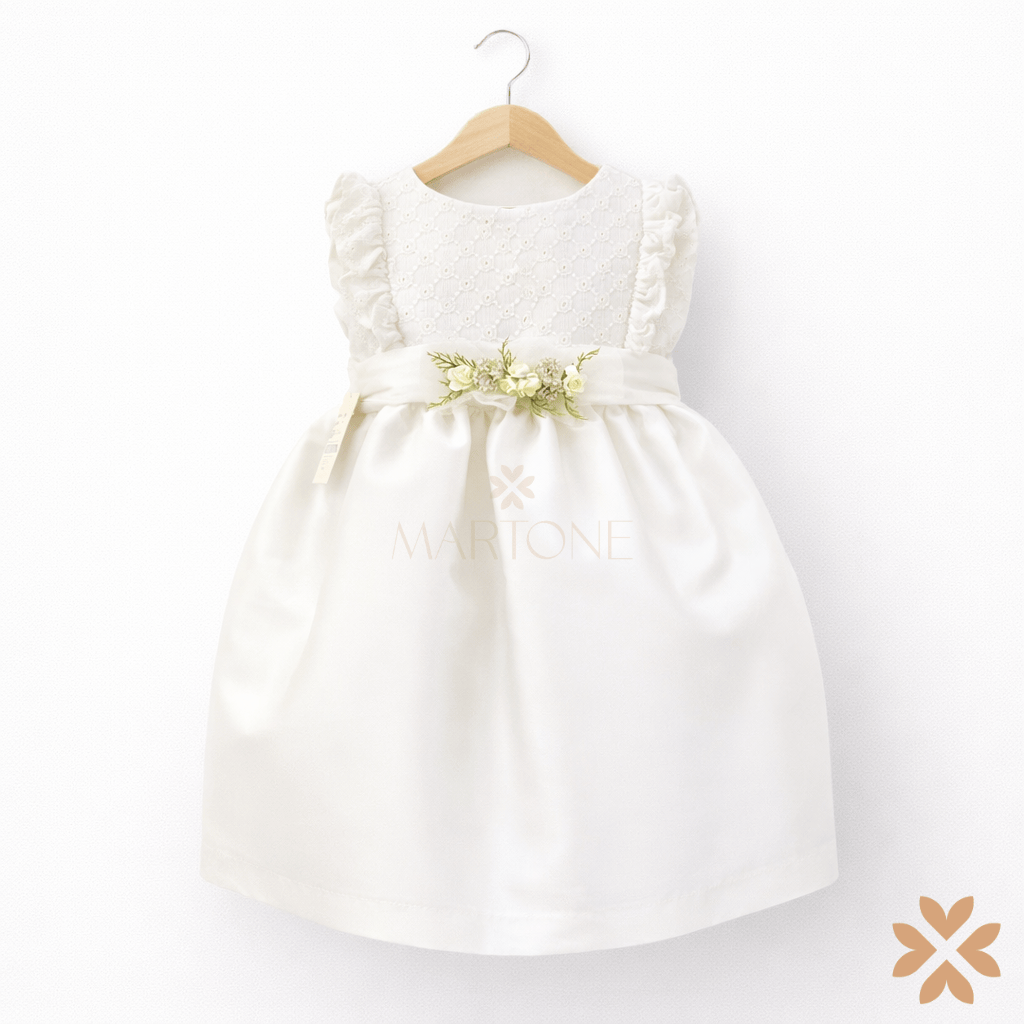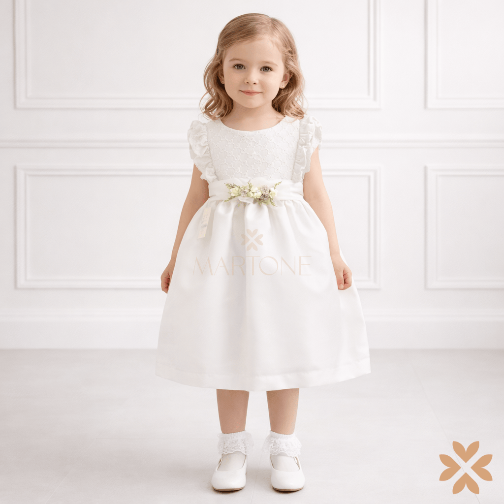 Abito damina composto da gonna in tessuto duchesse e corpetto in macramè. Cintura in tulle con dettaglio floreale.