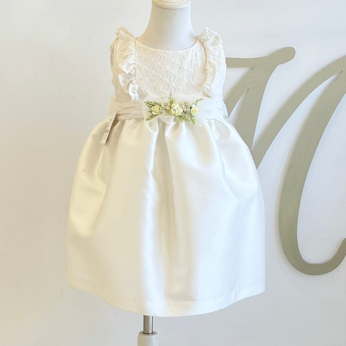 Abito damina composto da gonna in tessuto duchesse e corpetto in macramè. Cintura in tulle con dettaglio floreale.