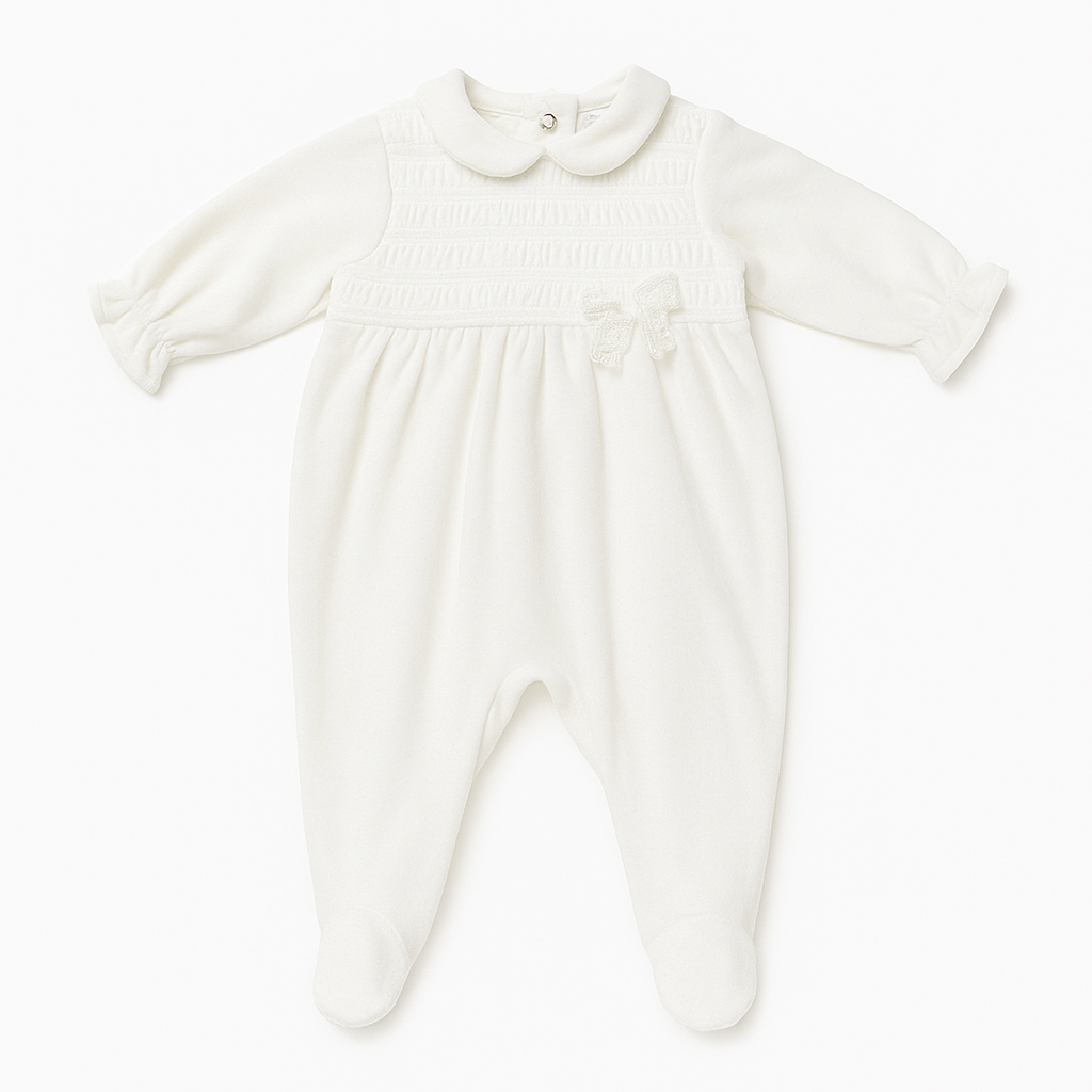 Tutina in ciniglia per neonata con ricamo in punto smock sul petto. Modello a manica lunga con colletto e pratica chiusura con bottoni a pressione sul retro e sul cavallo.