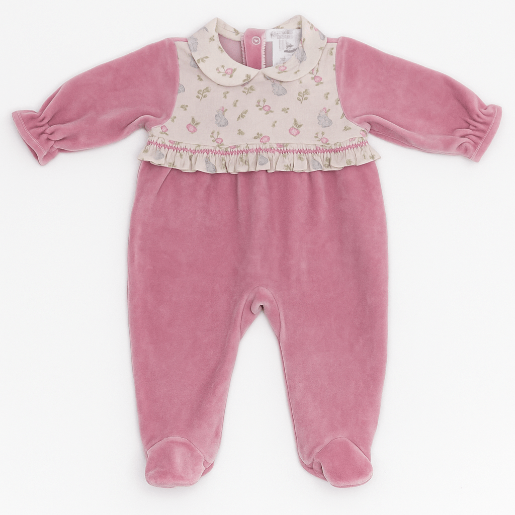 Tutina intera per neonata in ciniglia rosa, con parte superiore in tessuto stampato a fantasia con fiorellini e coniglietti. Rifinita con colletto tondo, arricciatura con piccolo volant e piedini integrati. Abbottonatura posteriore e lungo l’interno gamba con bottoncini automatici.
