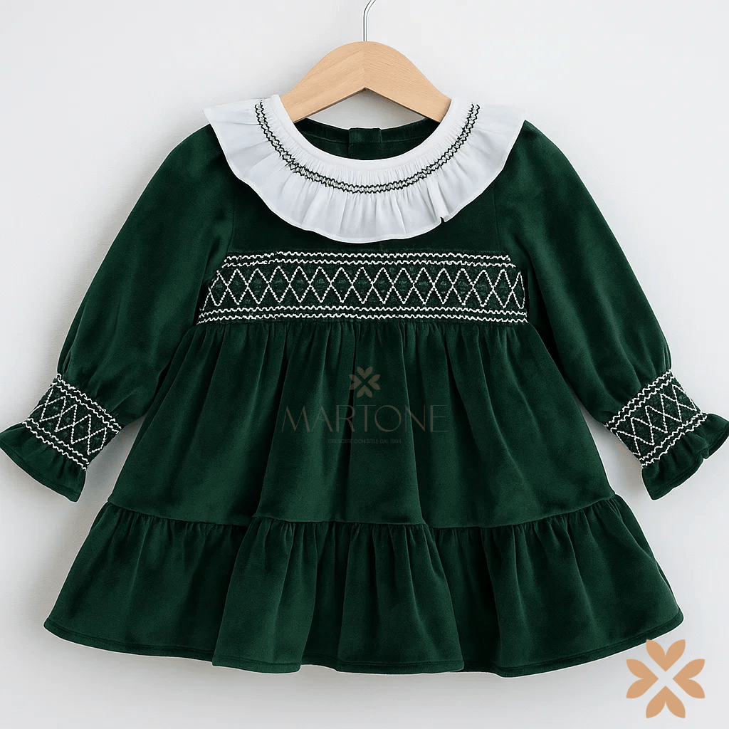 Abito in velluto verde bosco con chiusura invisibile sul retro con zip, arricchito da lavorazione smock sul corpino e sui polsini. Il colletto bianco arricciato con ricamo a contrasto dona un tocco di charme, mentre le balze conferiscono volume e movimento alla gonna. Un modello dal fascino classico e raffinato, ideale per le occasioni speciali della stagione fredda.