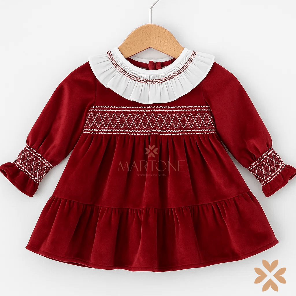 Abito in velluto con chiusura invisibile sul retro con zip, arricchito da lavorazione smock sul corpino e sui polsini. Il colletto bianco arricciato con ricamo a contrasto dona un tocco di charme, mentre le balze conferiscono volume e movimento alla gonna. Un modello dal fascino classico e raffinato, ideale per le occasioni speciali della stagione fredda.