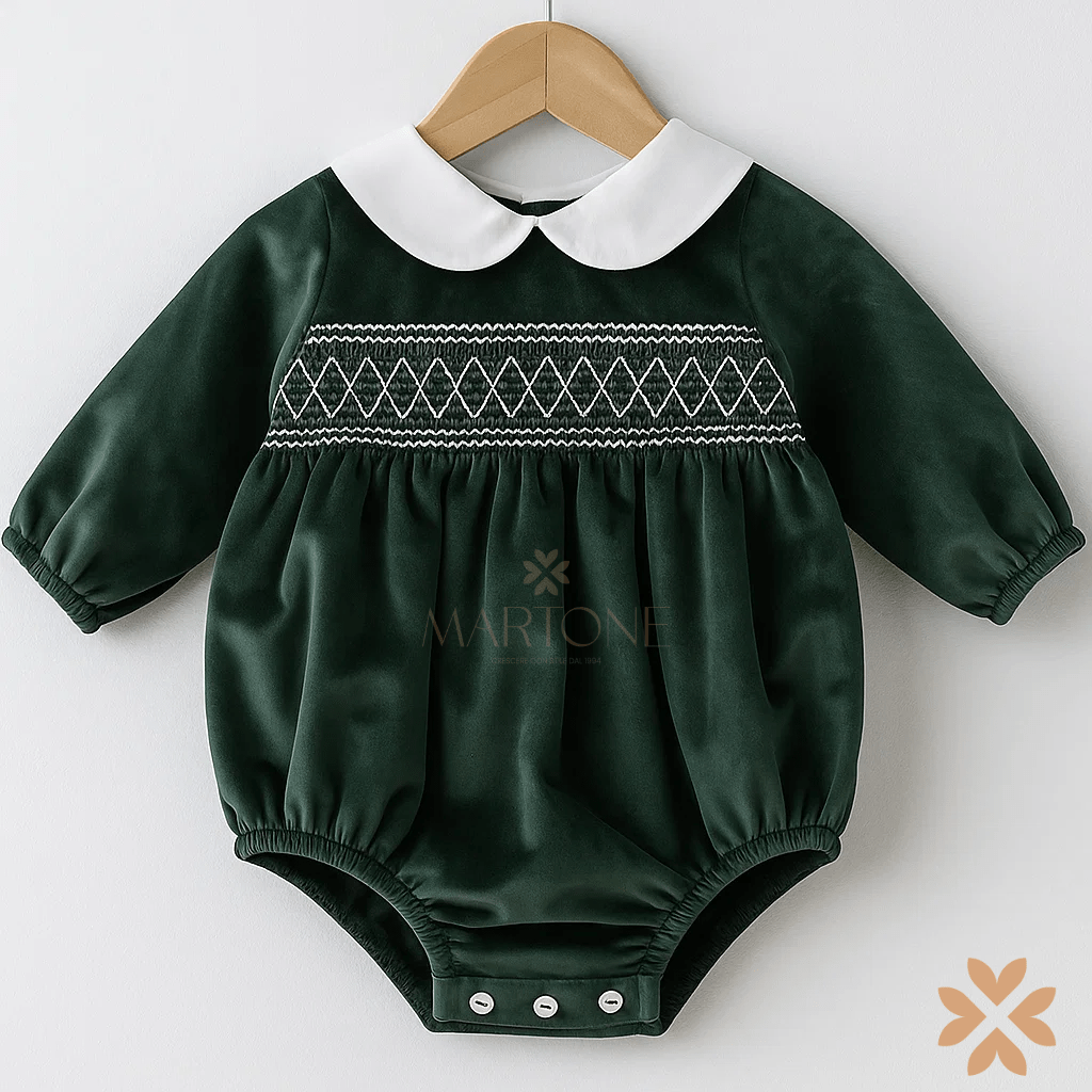 Pagliaccetto in velluto verde bosco con lavorazione punto smock sul corpino e polsini. Il colletto bianco arricciato con ricamo a contrasto aggiunge un tocco di eleganza senza tempo. Le balze morbide completano il design con movimento e raffinatezza. Perfetto per le occasioni speciali della stagione fredda, garantendo stile e praticità.