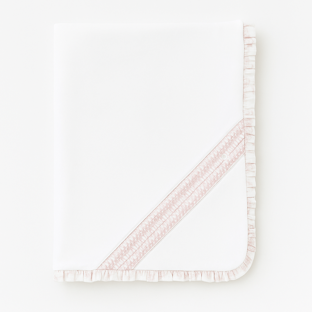 Copertina in ciniglia, rifinita con bordo a volant in fantasia rosa e decorata con inserto diagonale in punto smock coordinato. Morbida e avvolgente, ideale per culla e carrozzina.