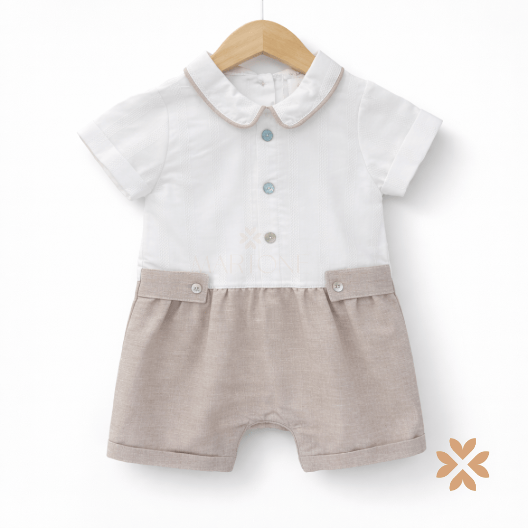 Tutina corta in cotone e lino con camicia integrata a manica corta. Colletto rifinito a contrasto, abbottonatura frontale con bottoni decorativi e parte inferiore in lino con tasche applicate. Linea pulita e proporzioni equilibrate, pensata per cerimonie estive e occasioni speciali.