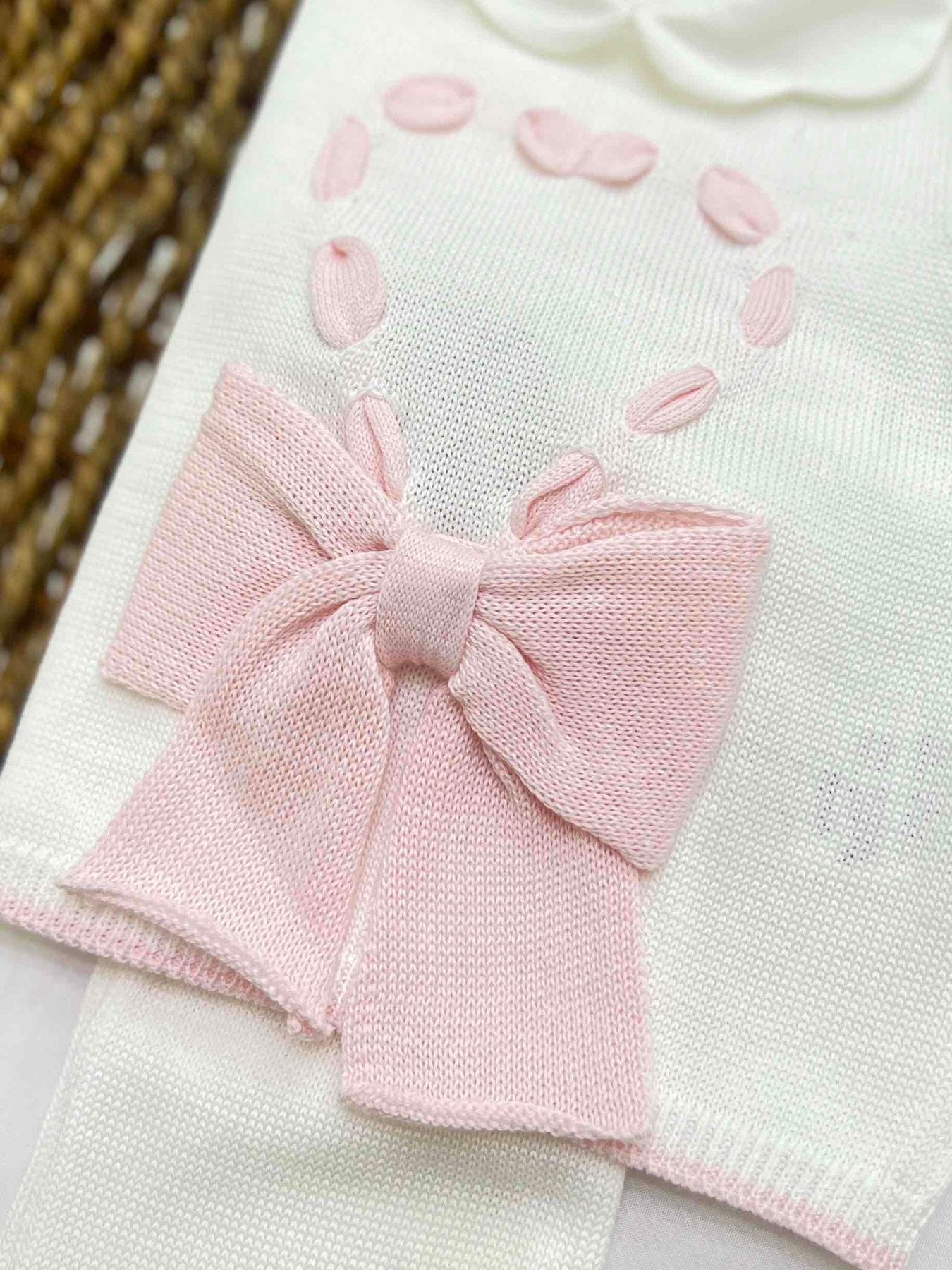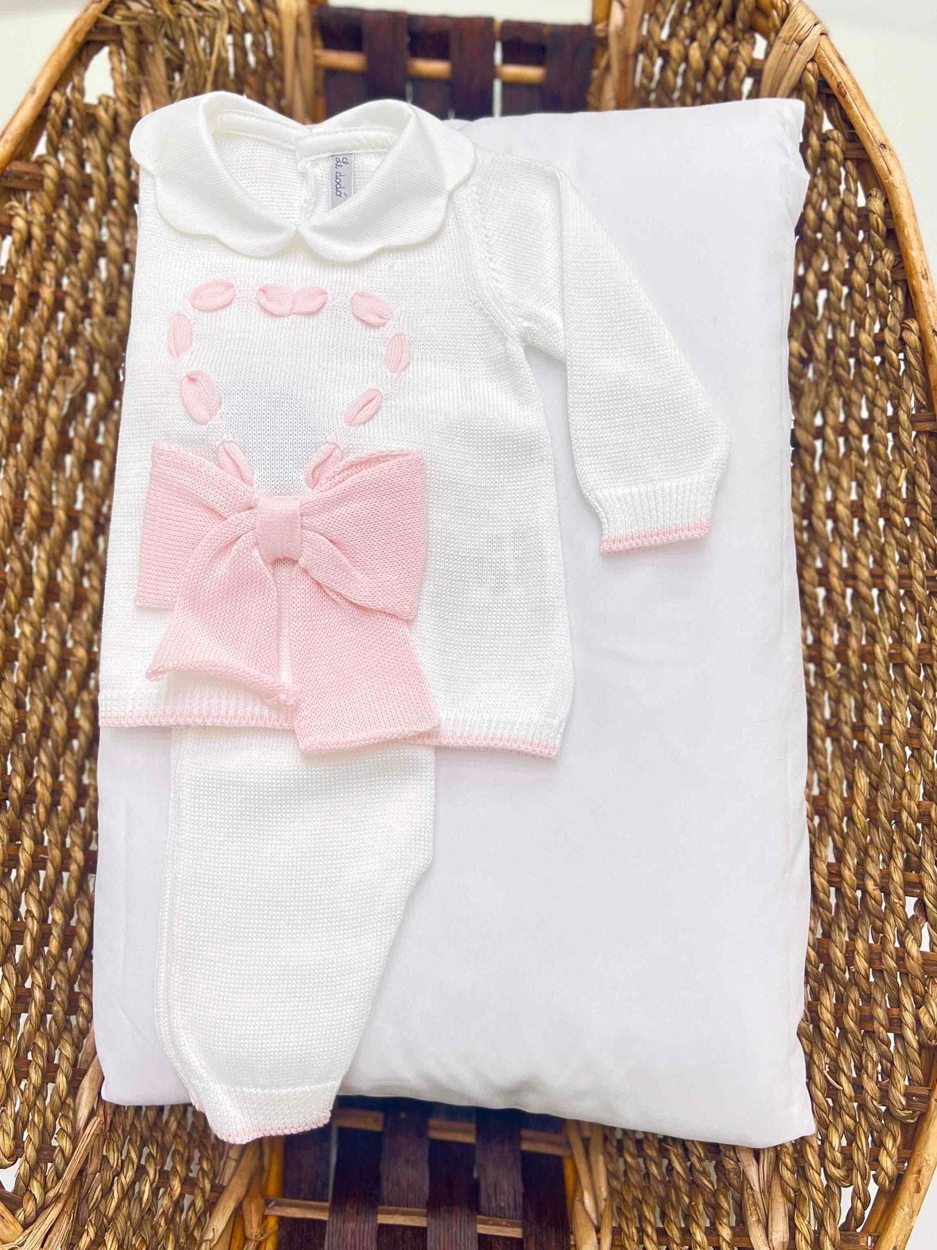 Completo clinico due pezzi neonata a manica lunga, con dettaglio di passamaneria a forma di cuore e fiocco.