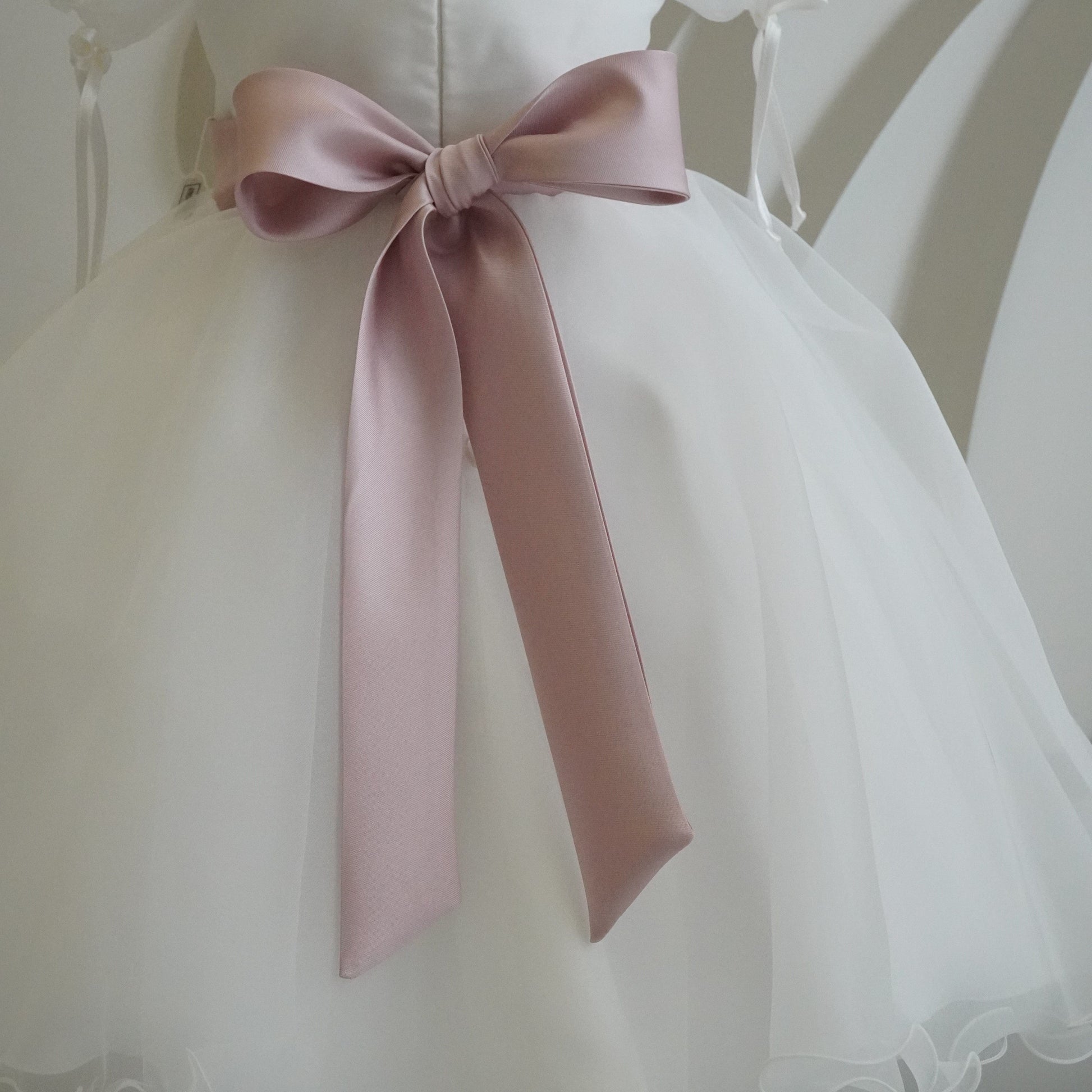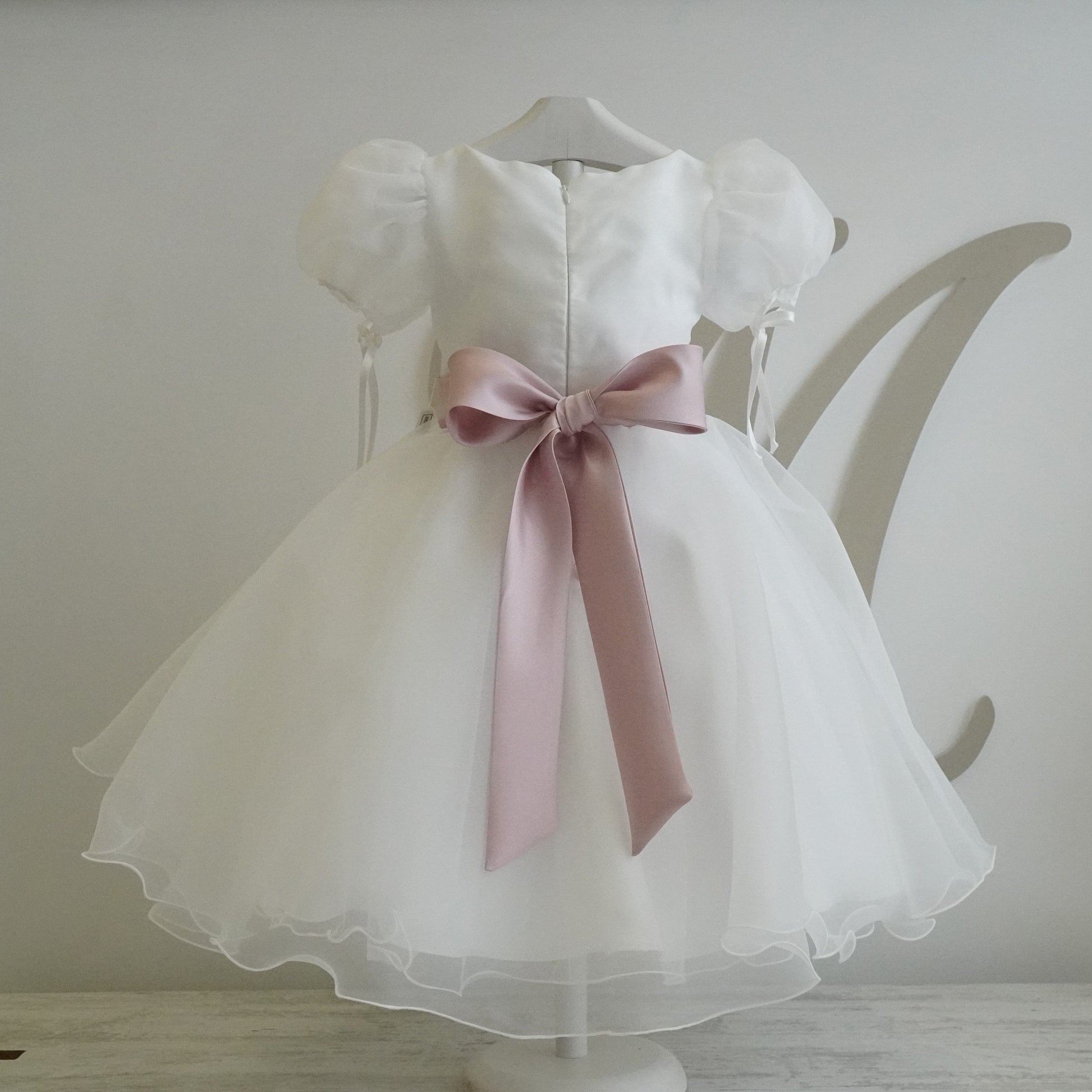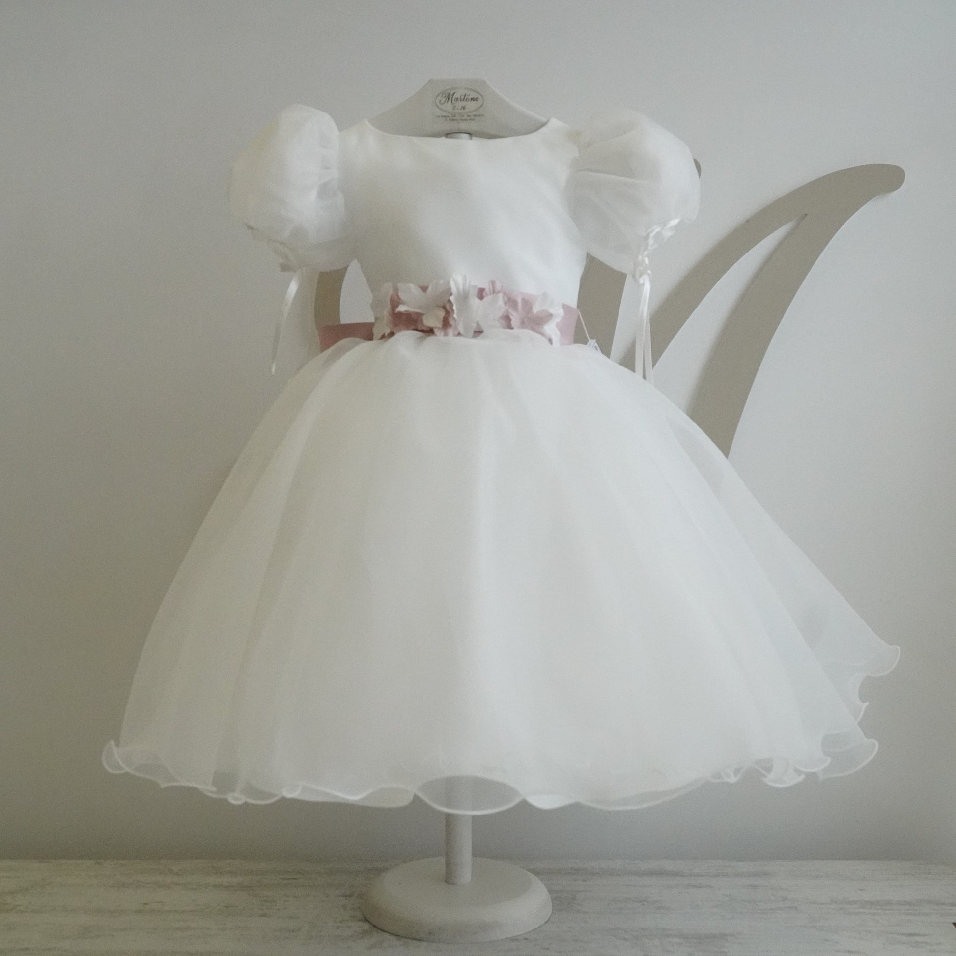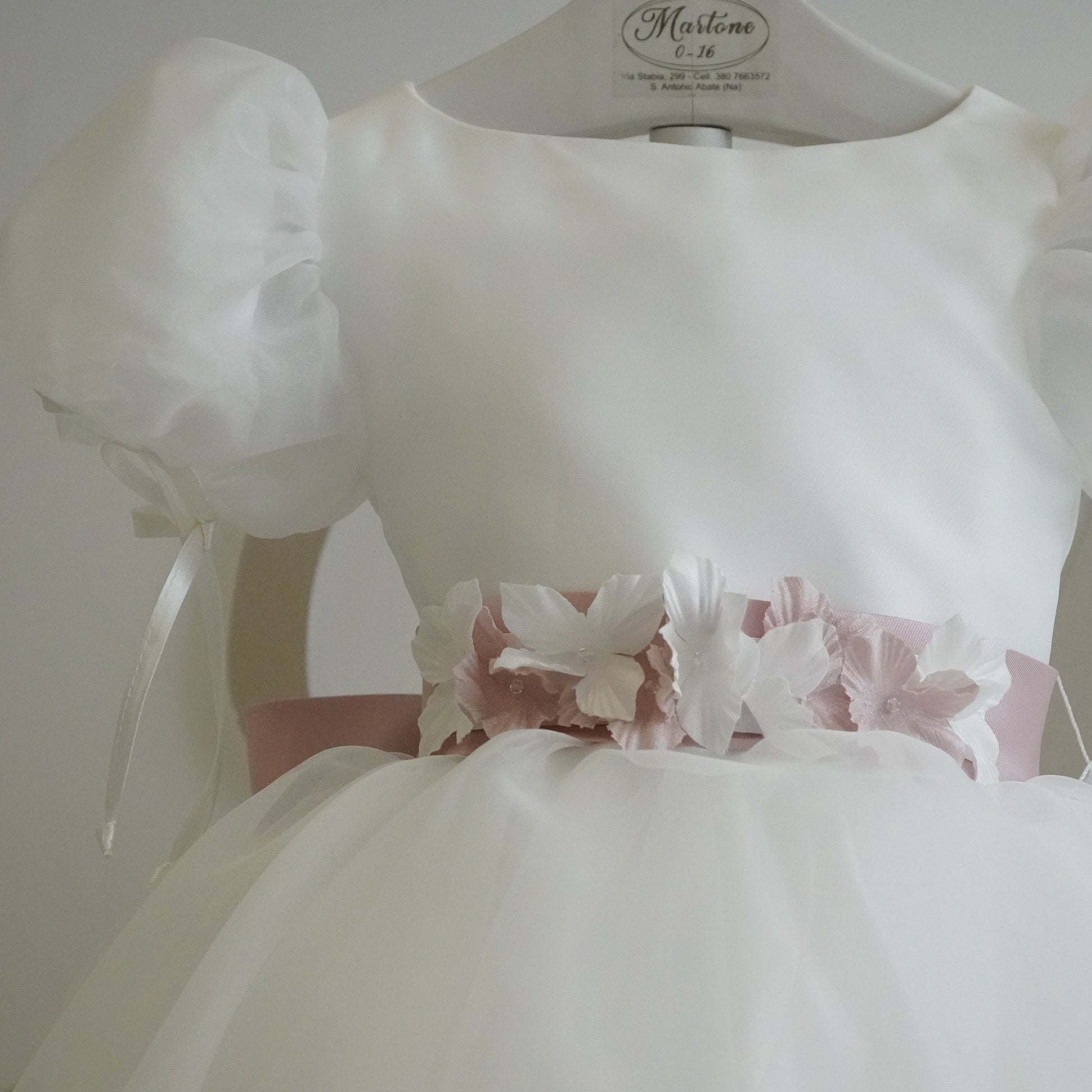 Abito elegante da cerimonia realizzato in organza in seta, gonna ampia a ruota con vari strati di tessuto, manica a sbuffo con fiocchetti, cintura in mikado con dettaglio floreale.