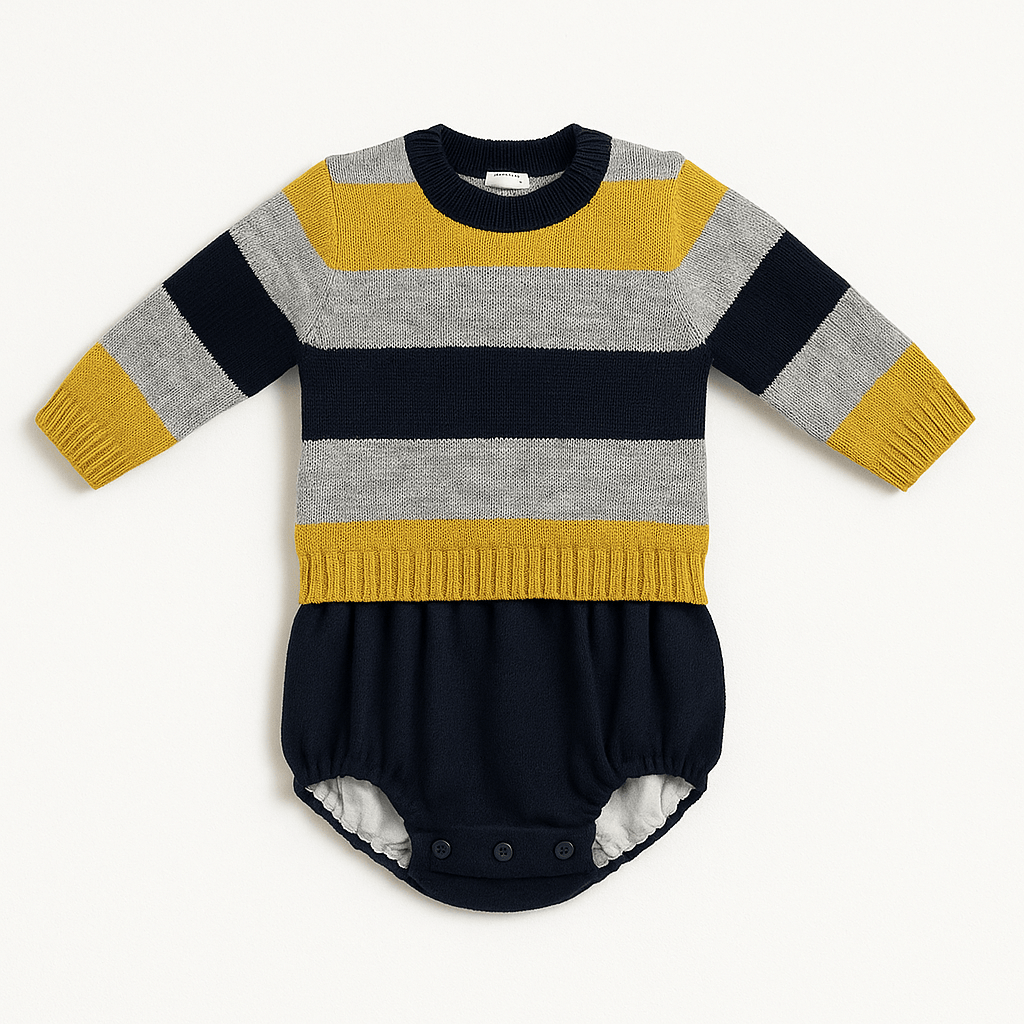 La parte superiore è lavorata a maglia con ampie fasce orizzontali nei toni del senape, grigio e blu navy, mentre la parte inferiore è realizzata in tessuto blu scuro leggero, con elastico alle cosce e bottoncini al cavallo per facilitare il cambio.