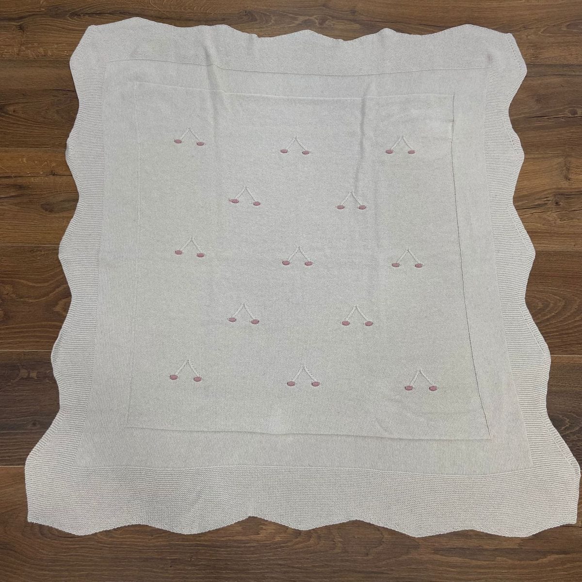 Copertina smerlata con ricami bicolore,grigio e rosa.