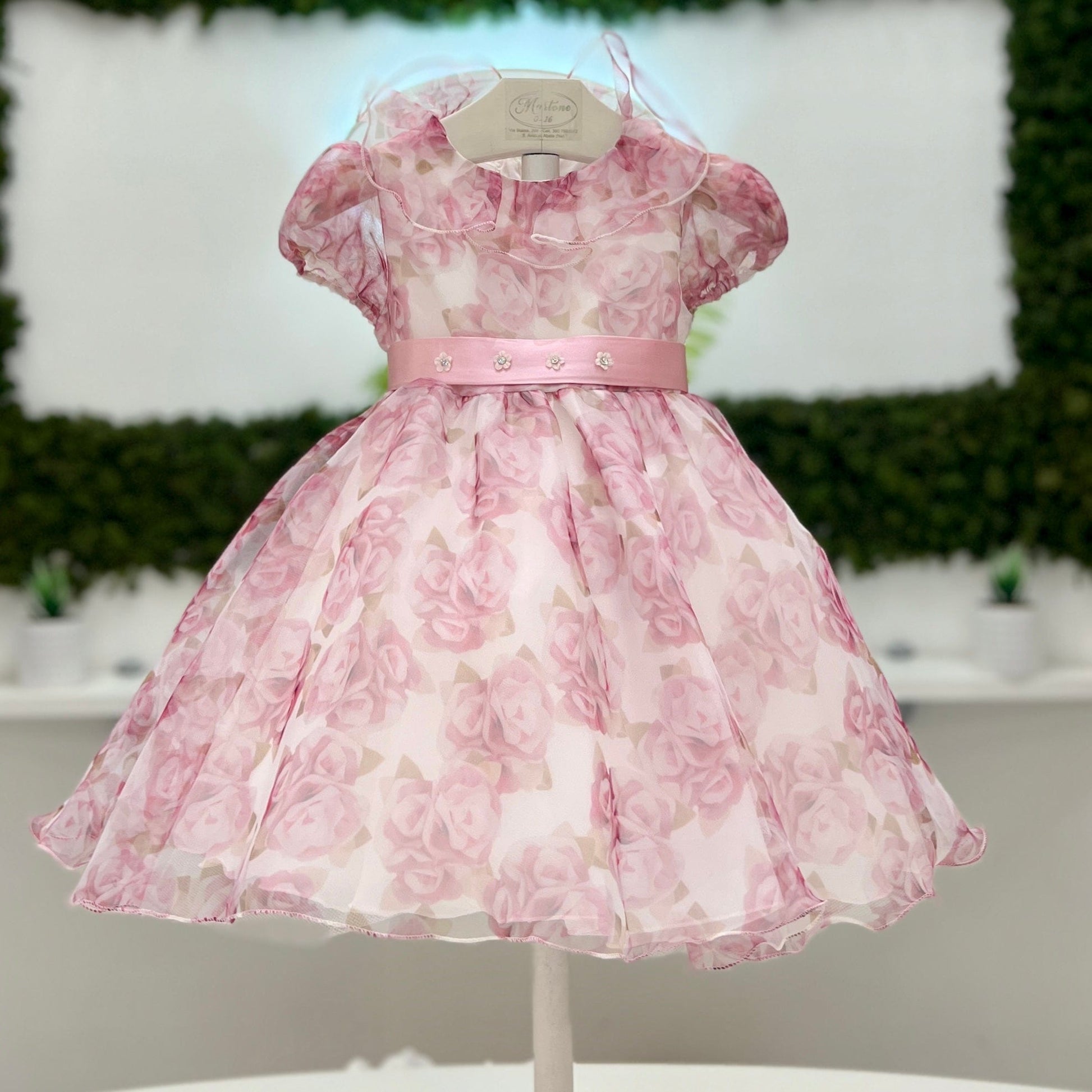 Abito in organza con stampa floreale, cintura in vita in raso con fiocco.