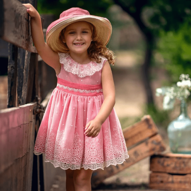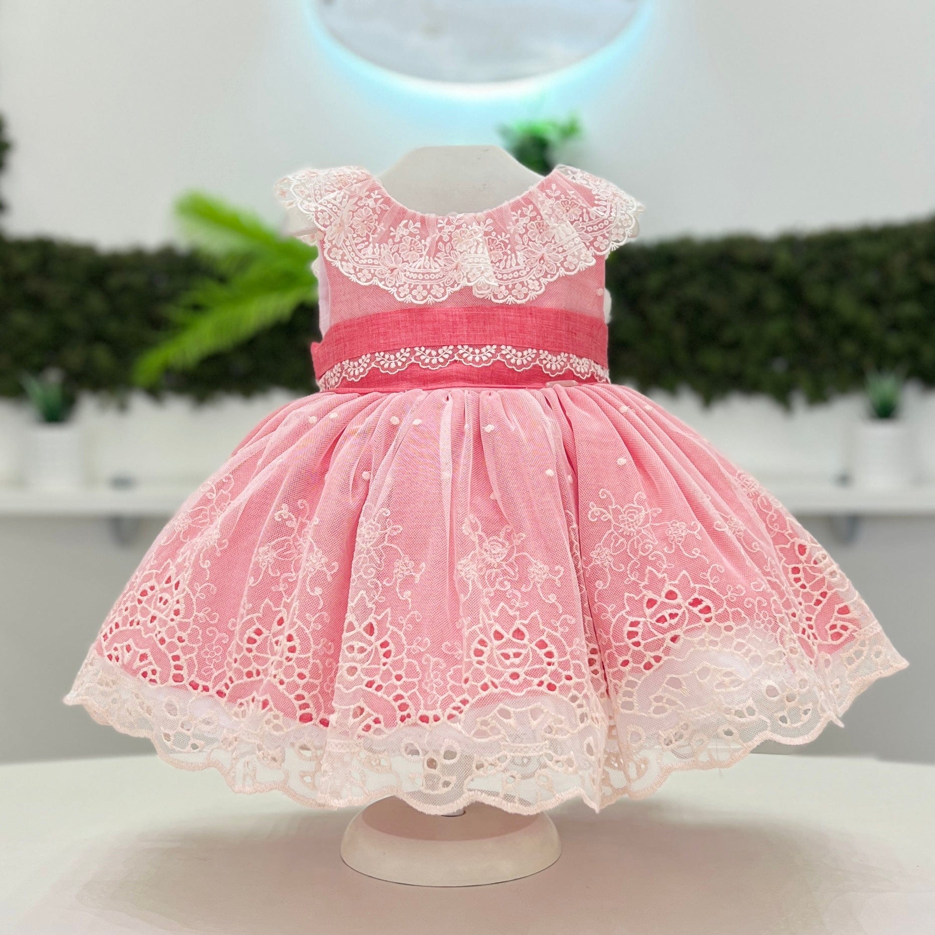 Un abito corallo dal fascino senza tempo, realizzato in lino e tulle plumetis, per un effetto leggero e raffinato. I bordi ricamati aggiungono un tocco di pregio, mentre il colletto con rouches in pizzo incornicia delicatamente il viso con eleganza. La fascia in vita in lino esalta la silhouette con un dettaglio sofisticato. Completa il look la culotte copripannolino abbinata, per un outfit curato in ogni particolare. Perfetto per una cerimonia o un’occasione speciale, un abito che unisce stile e romanticismo in ogni dettaglio.