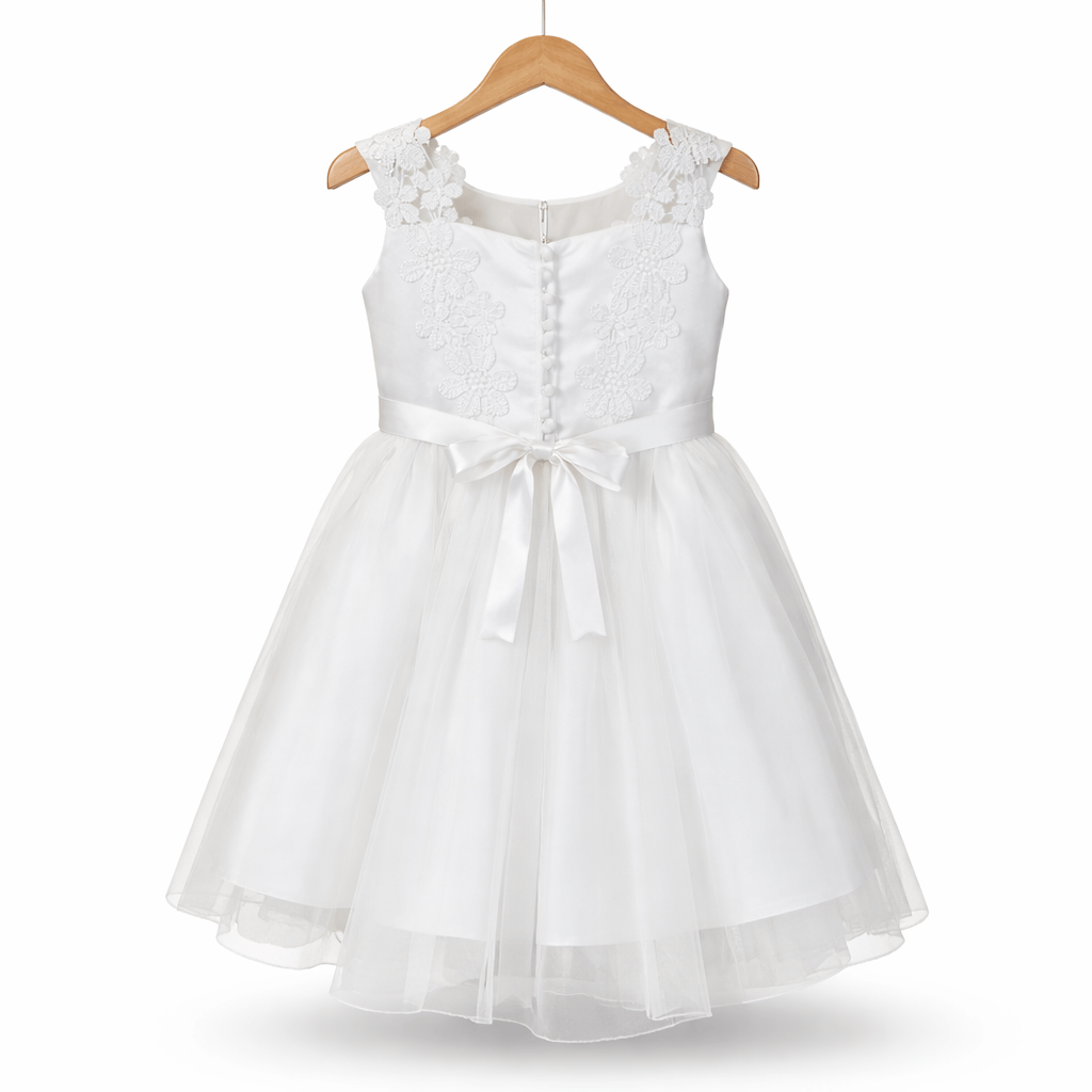 Abito con corpetto liscio e taglio pulito, vita definita e gonna in tulle con lunghezze sfalsate. Retro con apertura a cuore e chiusura con zip. Linea essenziale ed elegante.