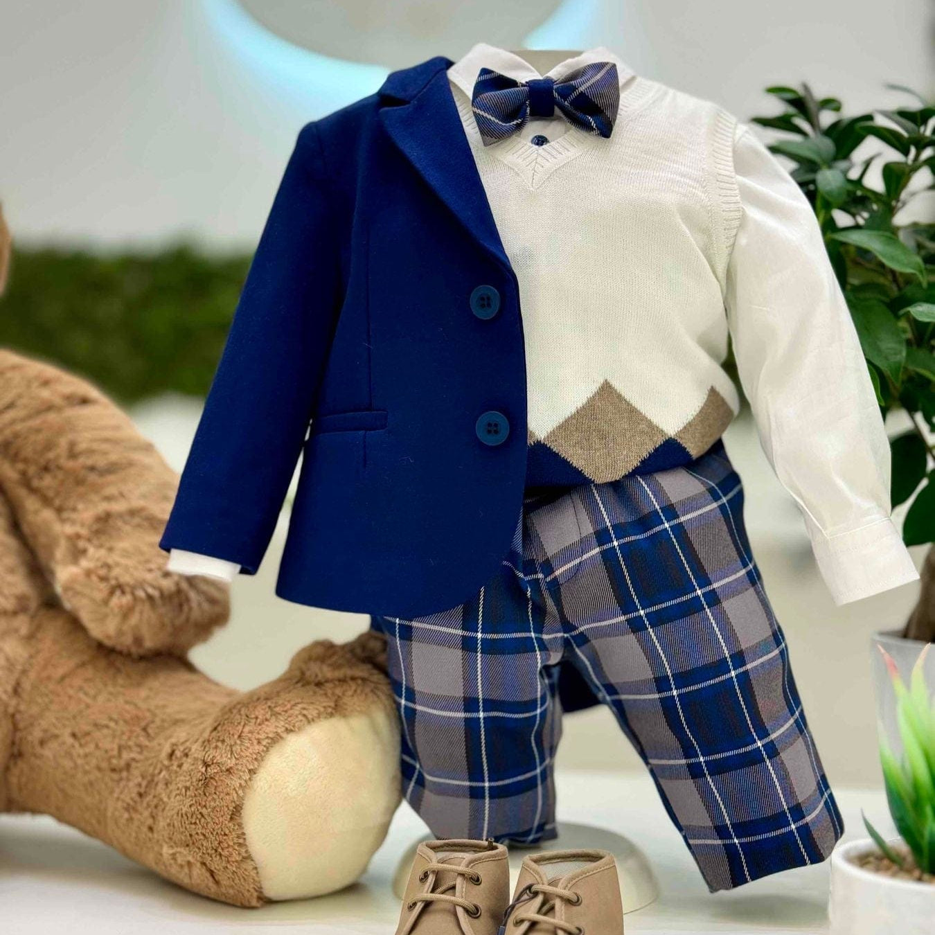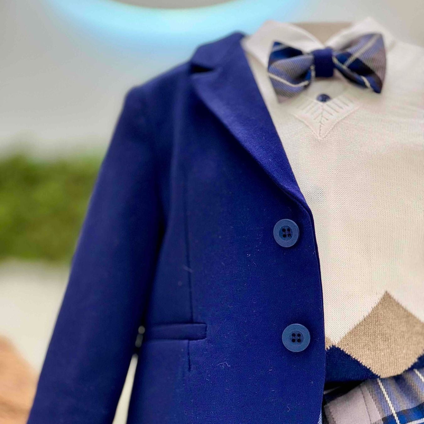 Completo composto da pantalone lungo scozzese con laccio e bottone,camicia,papillon,gilet di lana e giacca blu