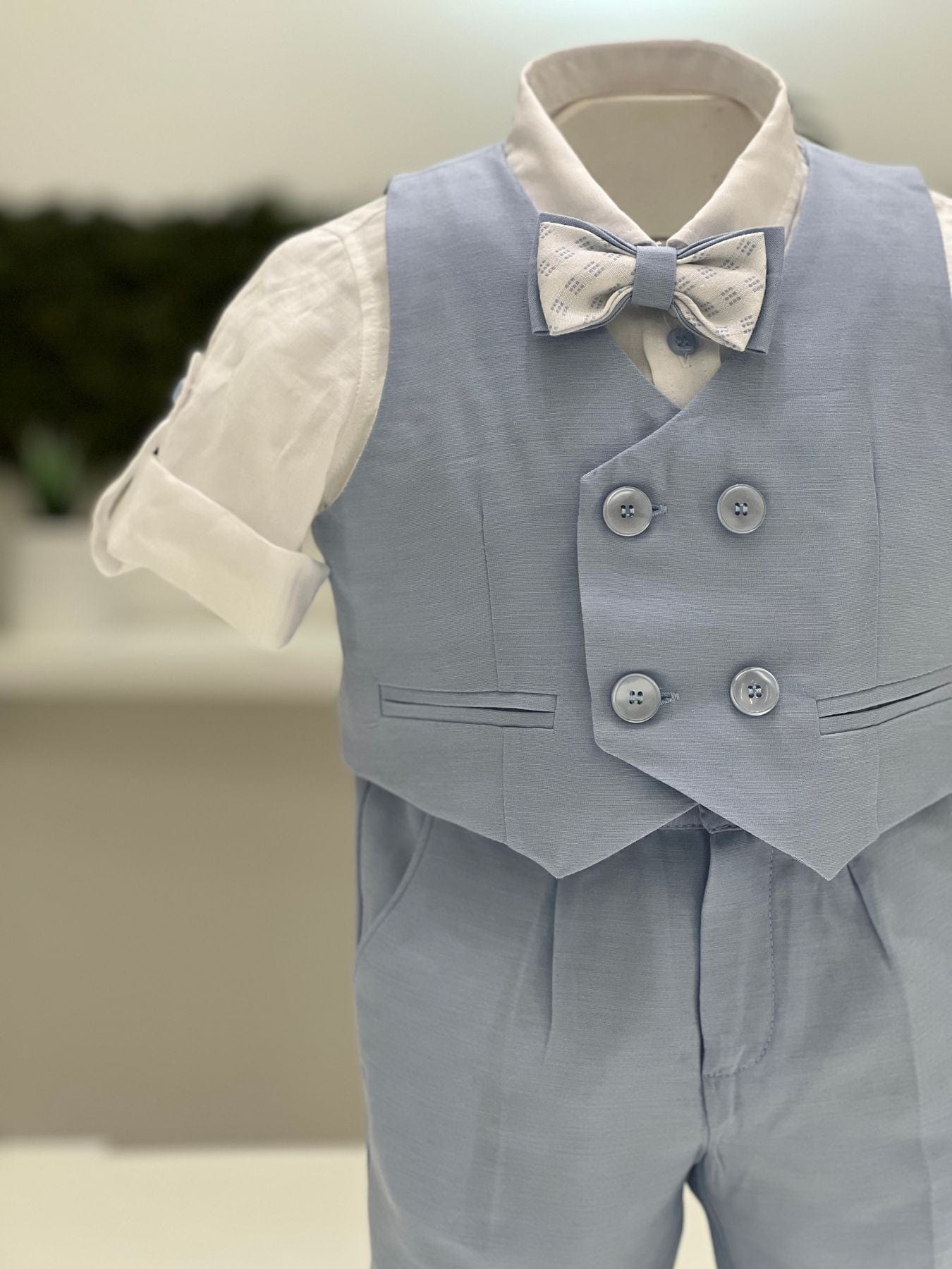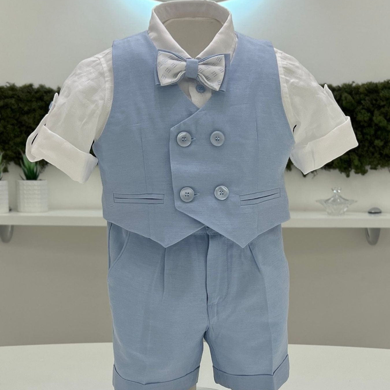 Abito battesimale neonato composto da gilet in taffetà di seta, camicia in cotone con papillon abbinato e bermuda.
