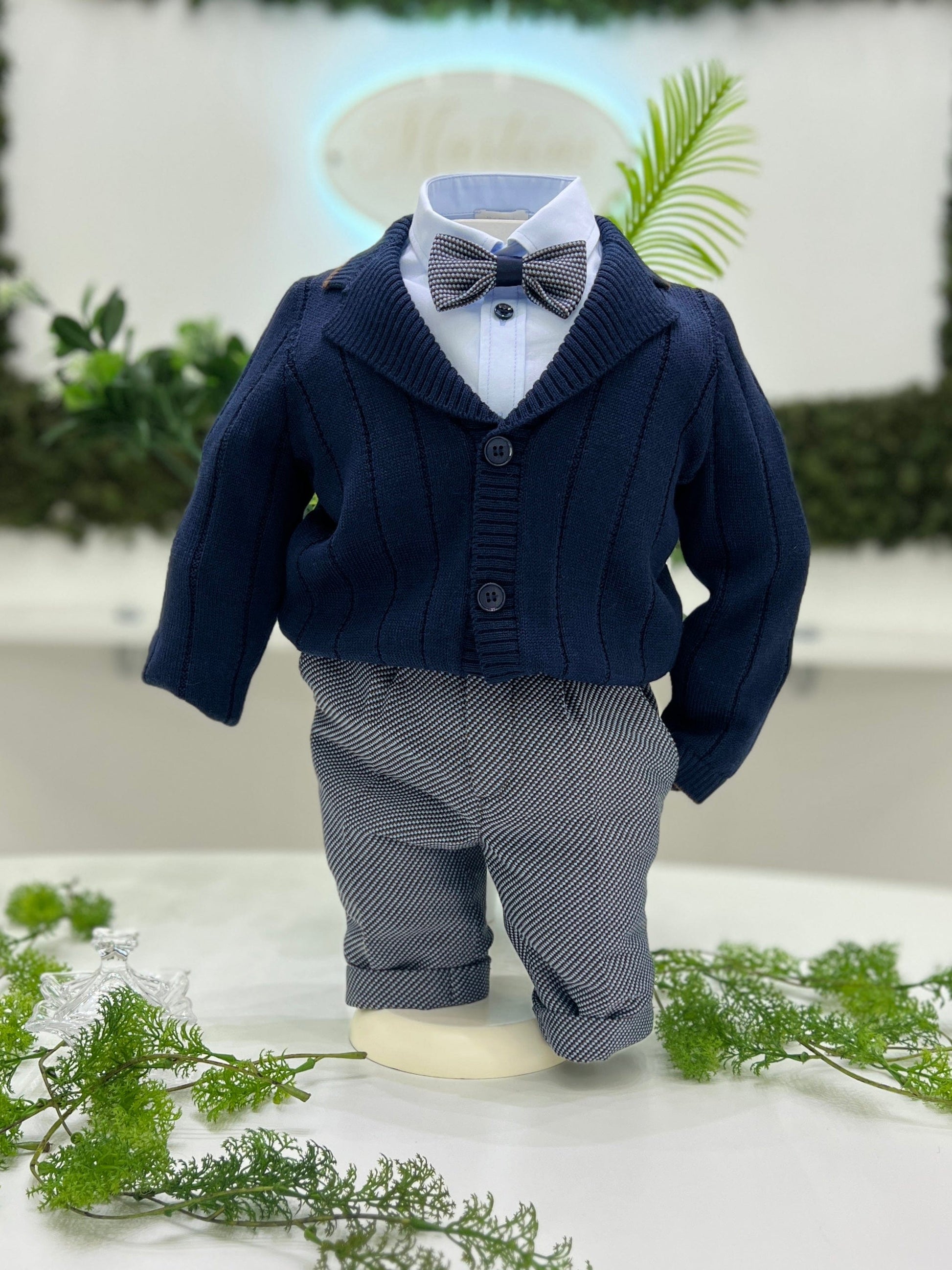 Completo elegante bimbo composto da pantalone con risvolto in microfantasia, cardigan con reverse, camicia celeste in cotone e papillon coordinato.