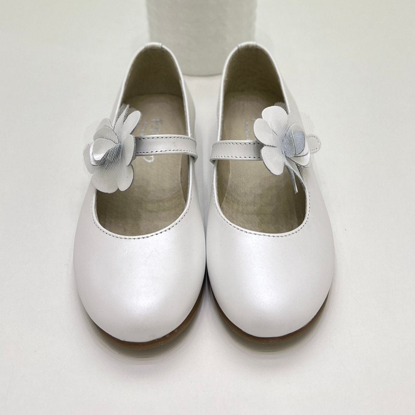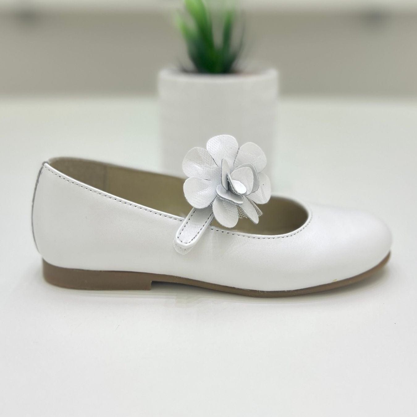 Ballerina bimba in pelle con fiore color bianco perlato.