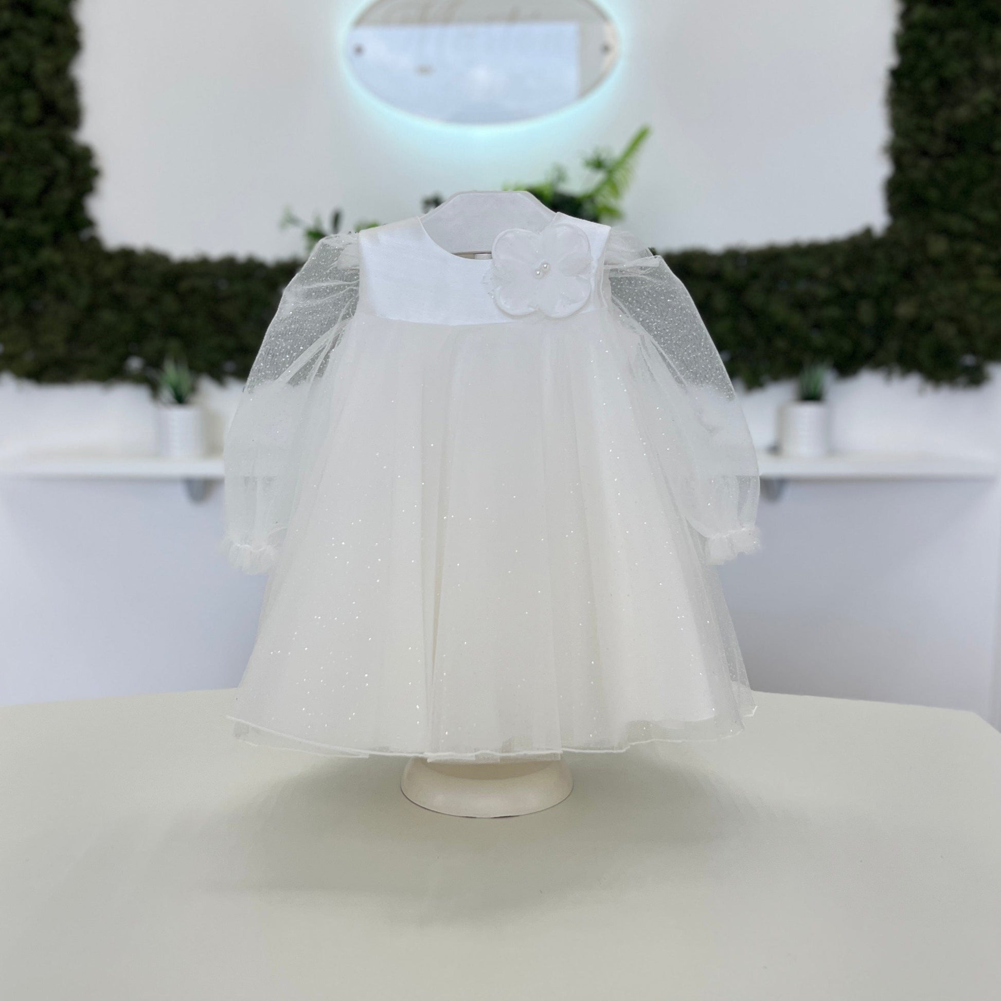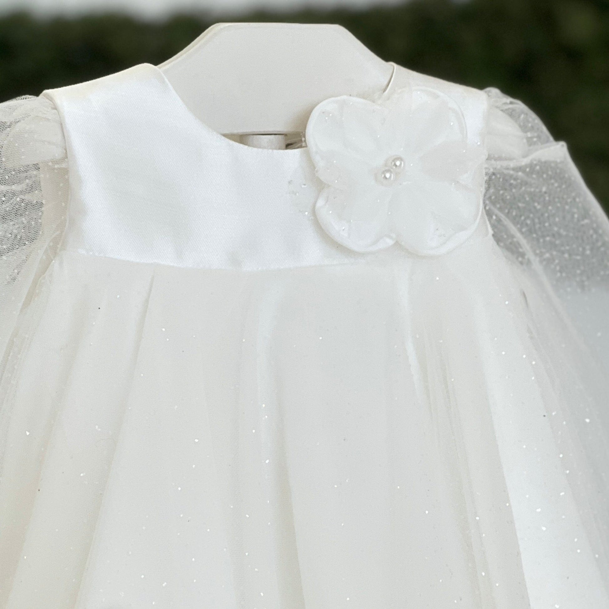 Abito battesimale in tulle glitterato con corpino in raso lucente, impreziosito da fiore applicato con perline. Maniche lunghe in tulle trasparente con delicata arricciatura al polso. Linea morbida dalla vestibilità fluida, ideale per una cerimonia dallo stile impeccabile.