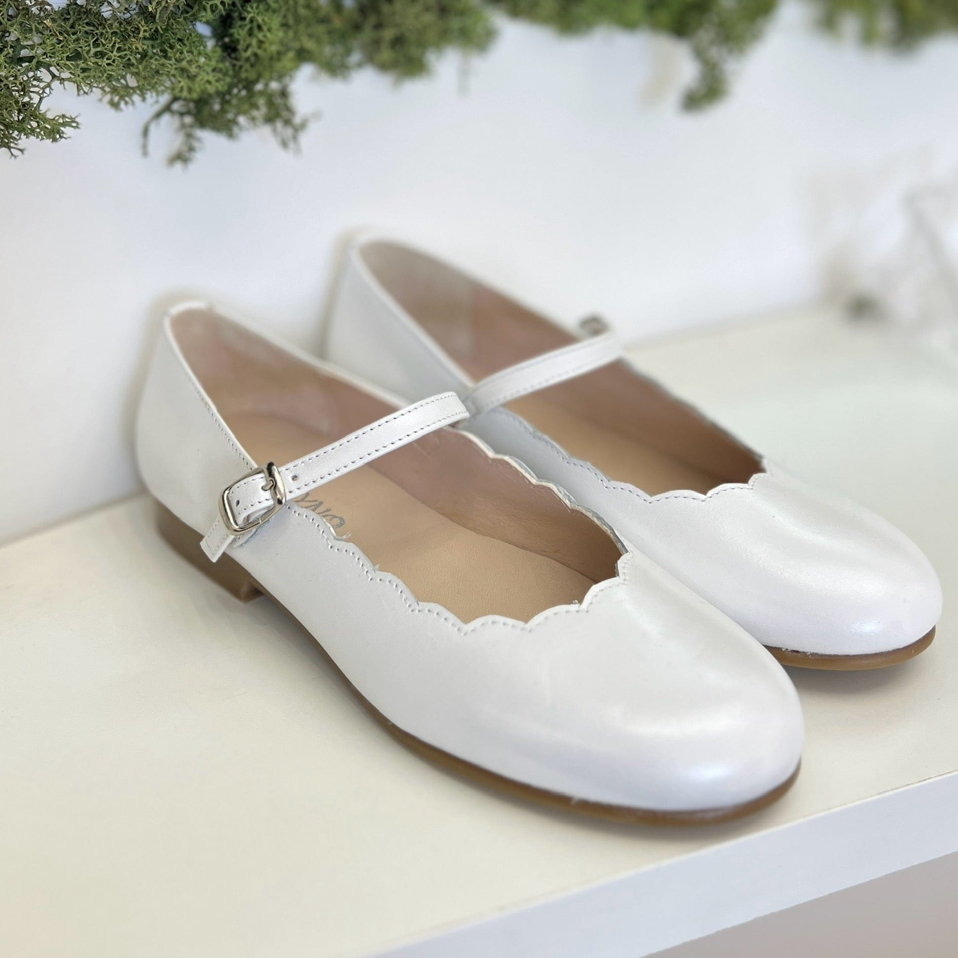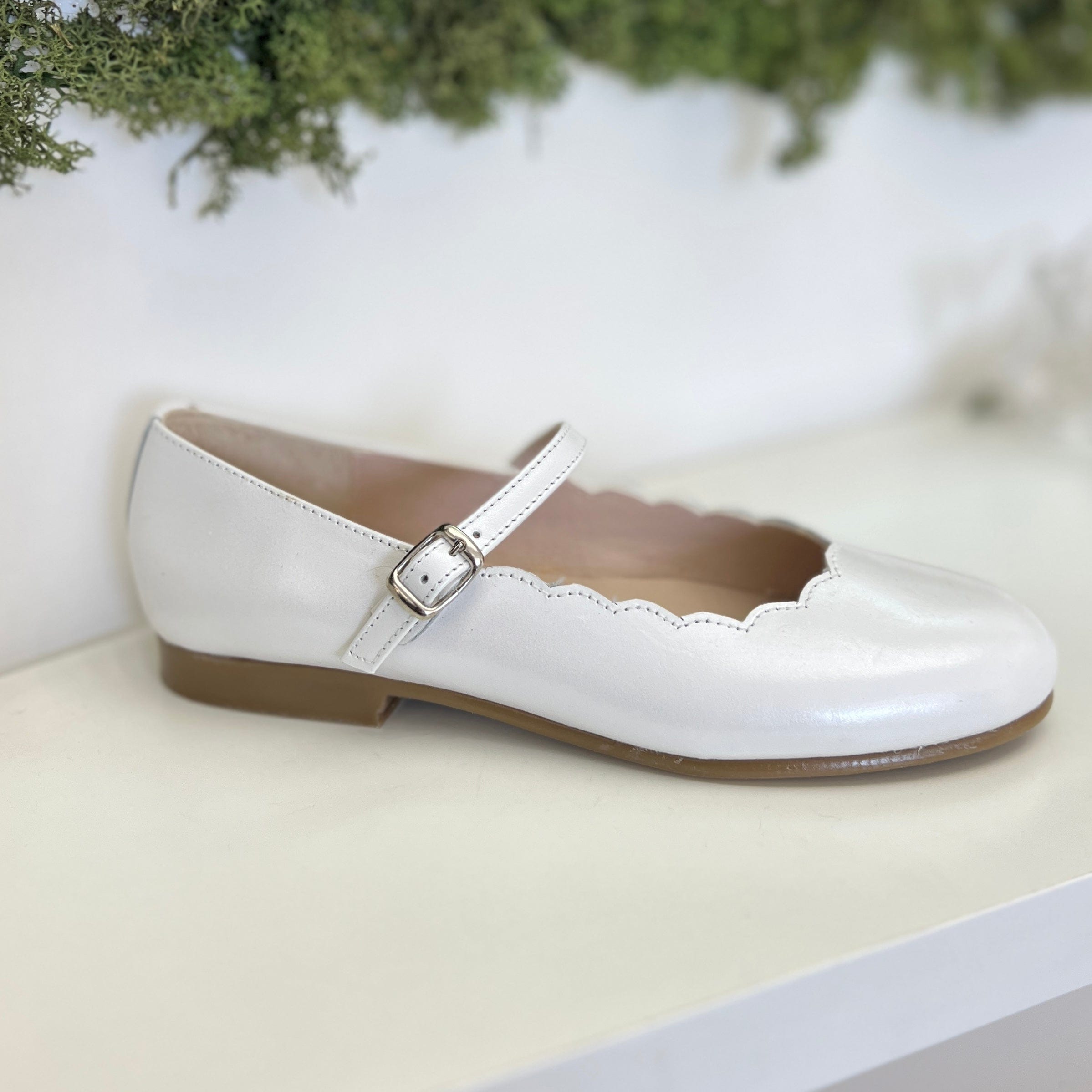 Ballerina elegante da cerimonia color panna in pelle, cinturino regolabile, plantare anatomico e suola antiscivolo.