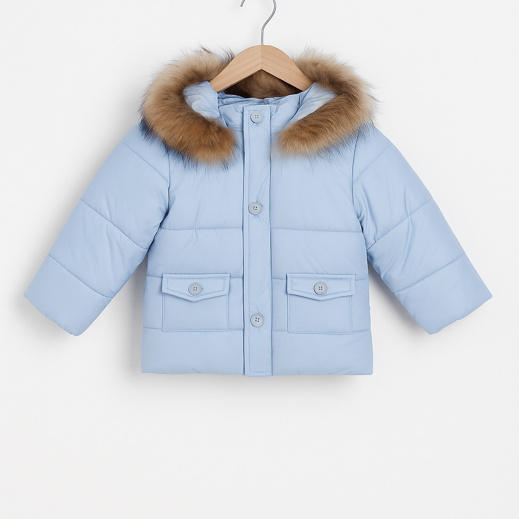Giubbotto imbottito per bimbo con cappuccio, rifinito da bordo in eco-pelliccia. Chiusura frontale con bottoni e zip nascosta, tasche applicate con bottone. Realizzato in tessuto 100% poliestere. Ideale per garantire comfort e protezione nelle giornate fredde.