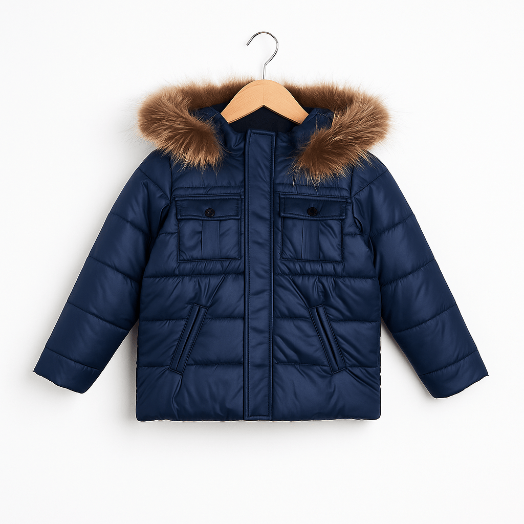 Giubbotto bimbo imbottito con cappuccio rifinito da bordo in eco-pelliccia. Chiusura frontale con zip e bottone, tasche superiori con pattina e tasche laterali inclinate. Modello caldo e pratico, ideale per la stagione invernale.