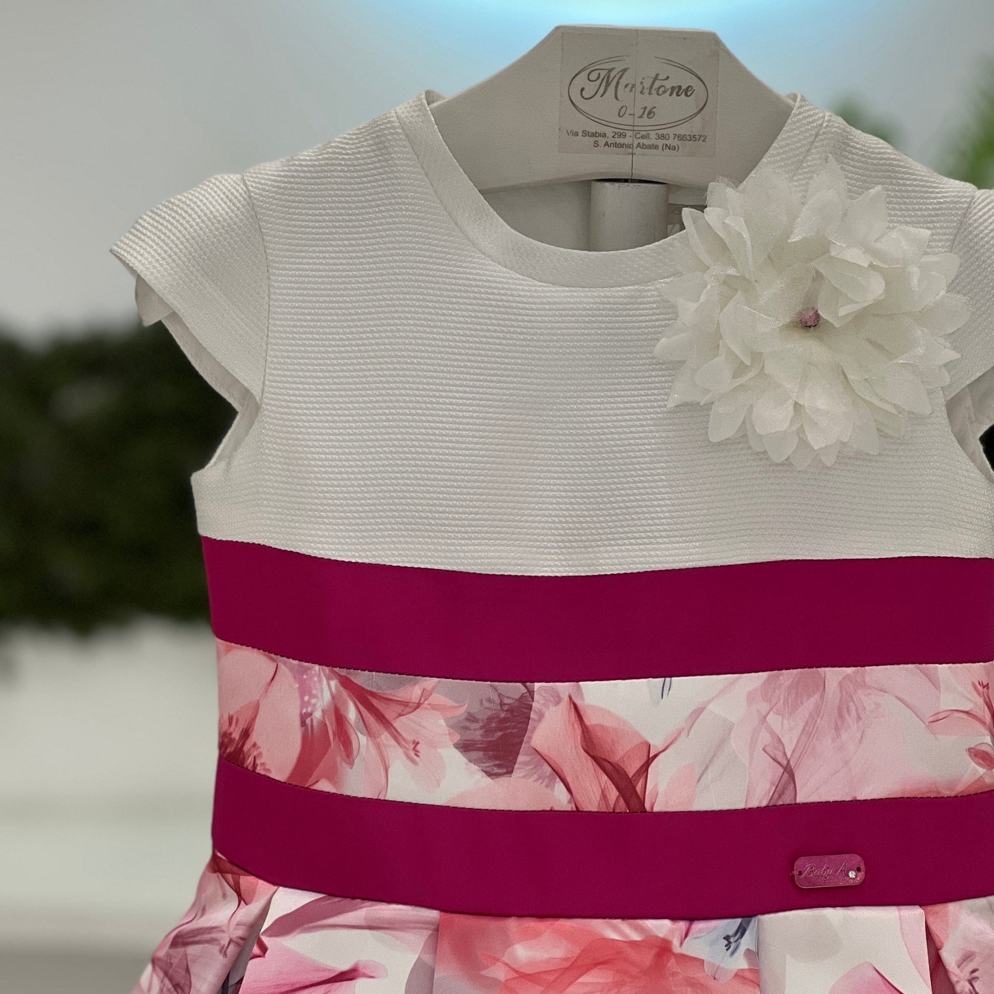 Abito elegante bimba, gonna strutturata con stampa floreale ed applicazione sulla spalla.