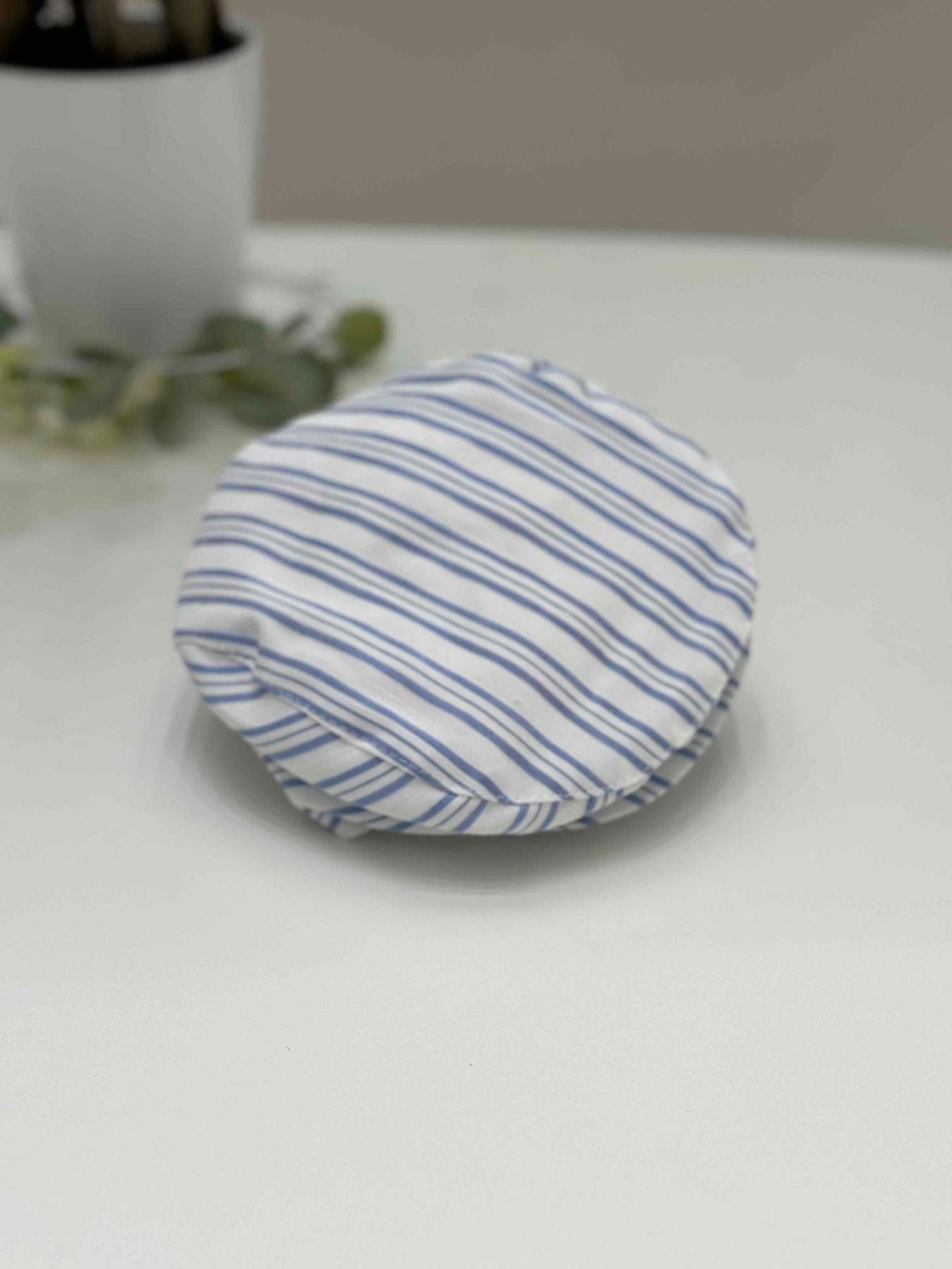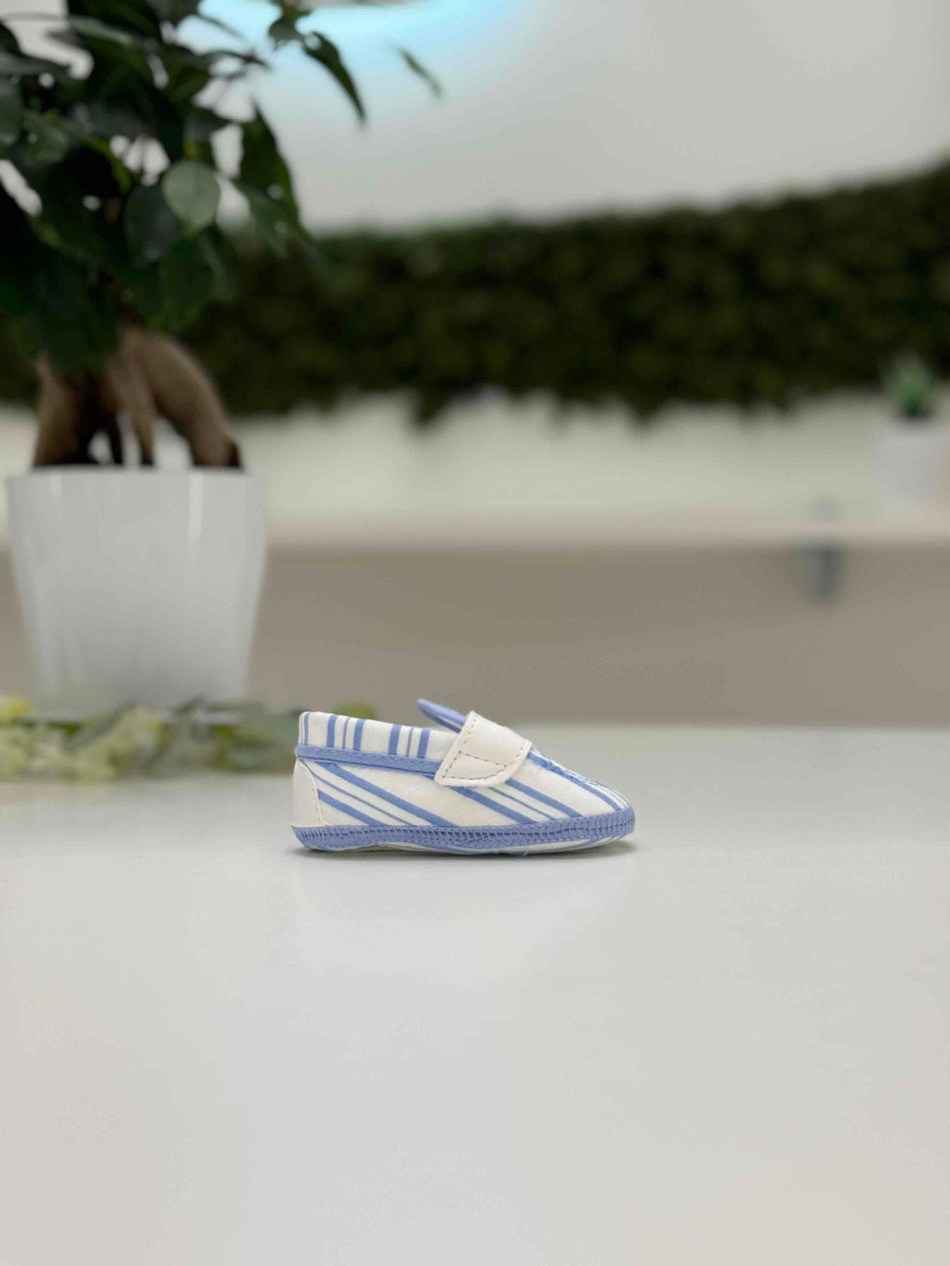 Abito battesimale composto da gilet in cotone con bordatura a righe, camicia body con risvolti in lino e bottoni azzurri, papillon con fantasia a righe e bermuda in lino a righe.