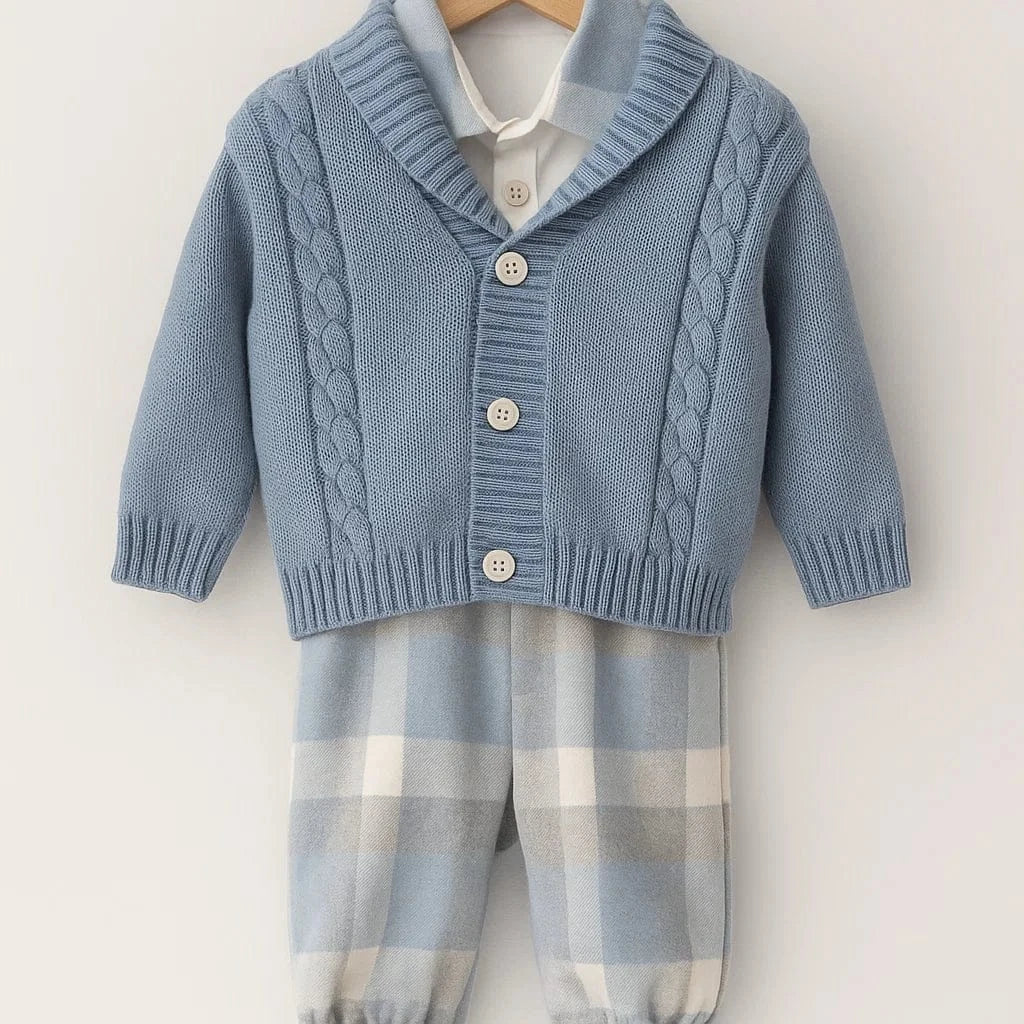 Completo elegante per neonato composto da camicia con colletto classico, cardigan in maglia azzurro con lavorazione a trecce, collo sciallato e bottoni tono su tono. I pantaloni a quadri in morbido tessuto, con fondo elasticizzato, completano l’insieme con un tocco raffinato e confortevole. Un look impeccabile, ideale per cerimonie e occasioni speciali.