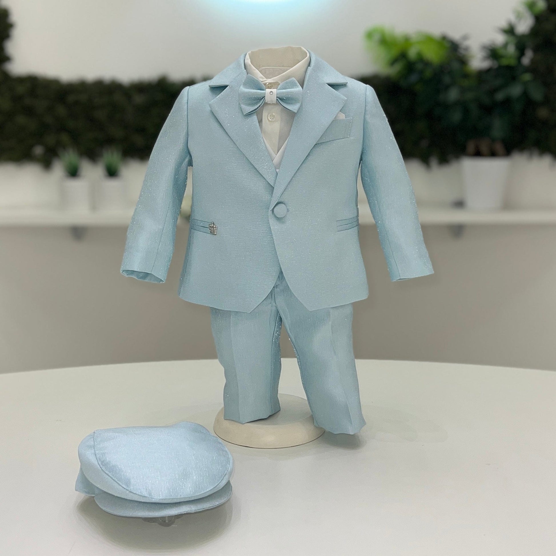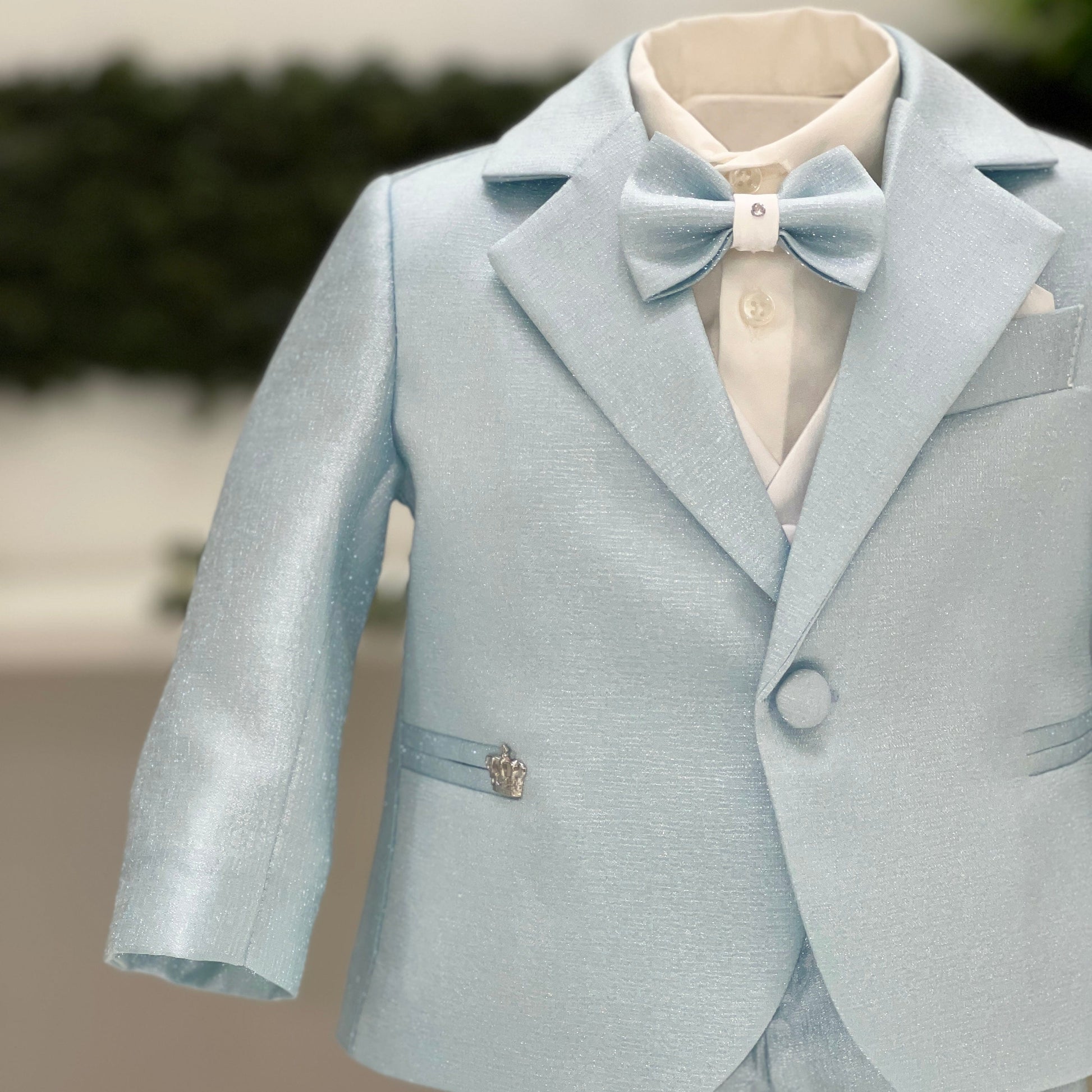 Un abito battesimale dal fascino luminoso e raffinato, interamente realizzato in un tessuto celeste impreziosito da microglitter, che donano un’eleganza scintillante ma delicata. La giacca con revers e tasca laterale a filo esprime classe e ricercatezza, valorizzata dai dettagli sartoriali. Il completo è perfettamente bilanciato dal gilet in tessuto bianco dall’effetto satinato, che aggiunge un tocco di contrasto sofisticato. La camicia in cotone bianco assicura freschezza e comfort, mentre il papillon coordinato, impreziosito da un punto luce, completa il look con un’eleganza esclusiva.