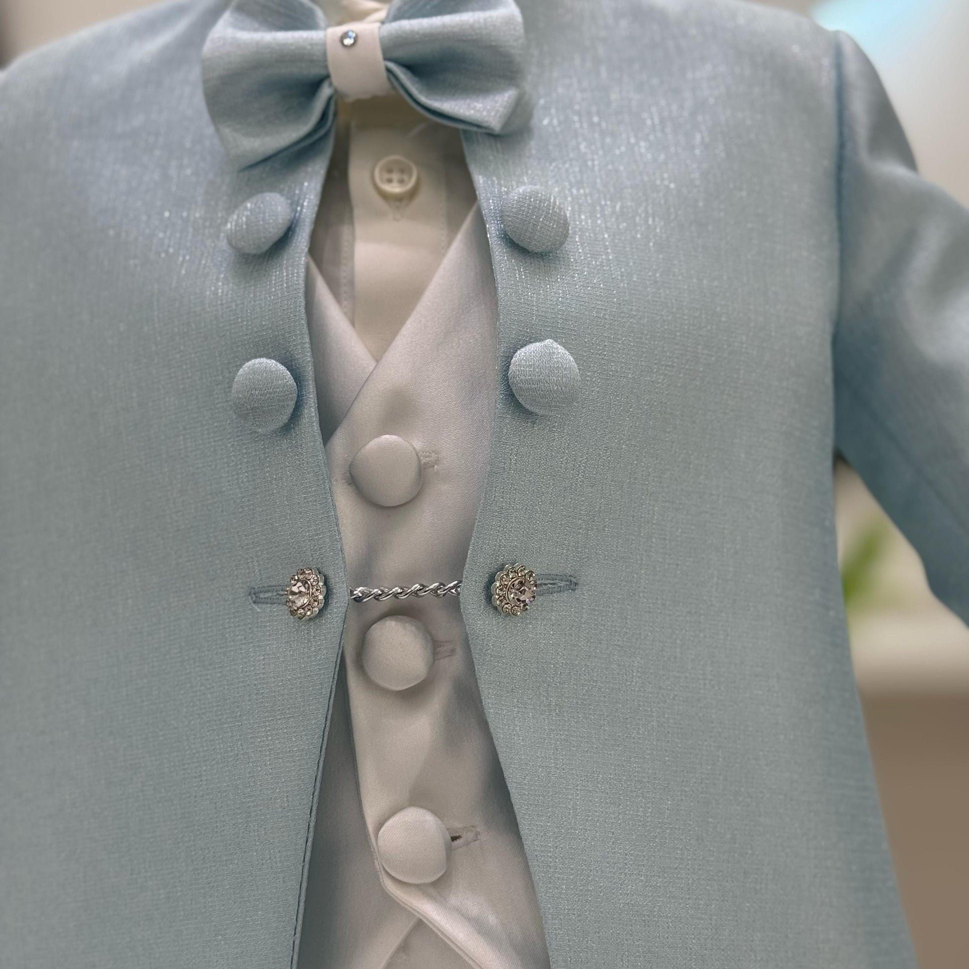 Un abito battesimale elegante e luminoso, perfetto per un’occasione speciale. La giacca celeste dal taglio coreano, realizzata in un tessuto pregiato con microglitter discreti che catturano la luce, è arricchita da bottoni rivestiti con dettaglio gioiello, per un tocco di raffinatezza. Il completo è armoniosamente bilanciato dal pantalone e dal gilet in tessuto bianco dall’effetto satinato, che donano eleganza e struttura. La camicia in cotone bianco assicura comfort e freschezza, mentre il papillon coordinato, impreziosito da un punto luce, completa il look con uno stile ricercato e sofisticato.